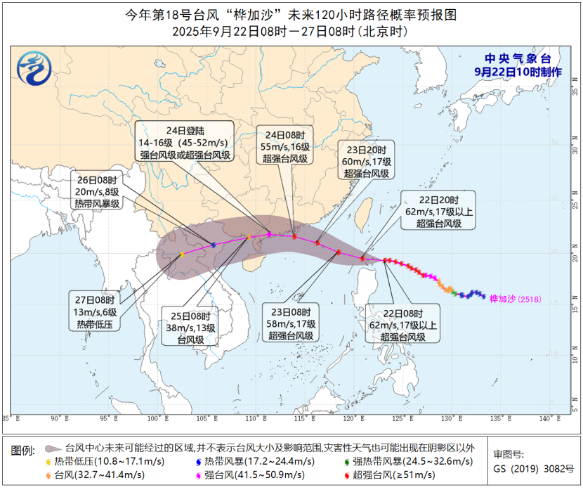 预计未来“桦加沙”继续向偏西方向移动,22日夜间穿过巴士海峡进入南海,趋向广东中西部至海南岛东北部一带沿海,于24日凌晨到中午以超强台风级从深圳市南侧100-200公里内掠过。