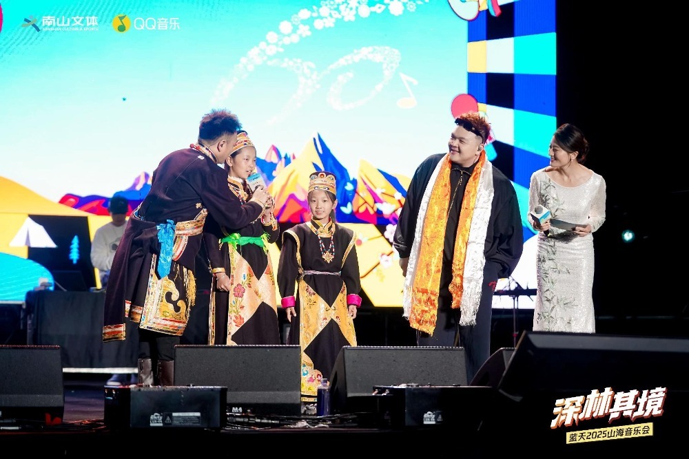 一首《活着》带动全场共舞,音乐会秒变高原蹦迪现场;“信笺回响”环节通过“看着北斗星走不迷路”的寄语,诠释了新时代的深刻意义。当夜幕渐深,泽绒拉姆和达桑嘉措的歌声如两条溪流交汇,民族与流行的旋律相融相生。当艾福杰尼压轴登场时,全场气氛达到顶点。首届“深林其境”音乐会上为艾福杰尼献哈达的两位藏族女孩也再度登场并带来惊喜演唱。