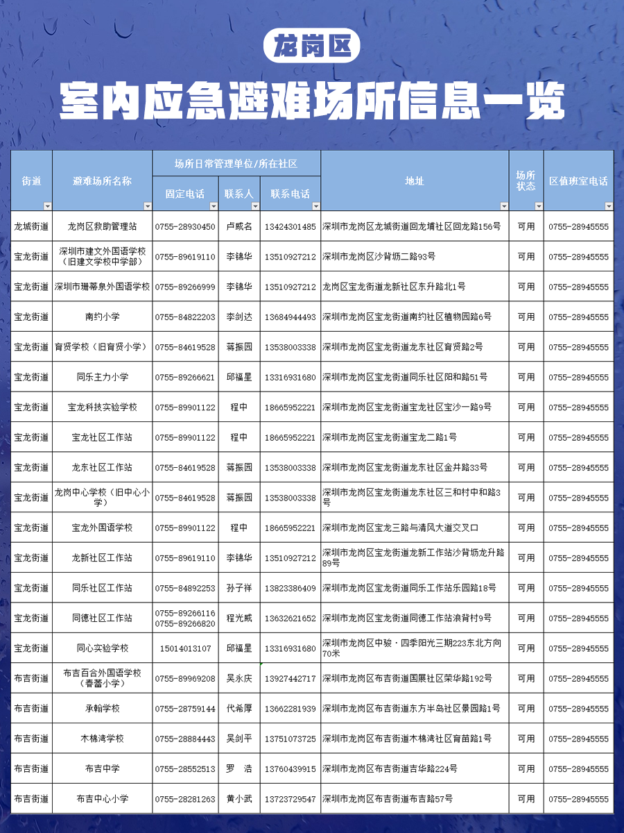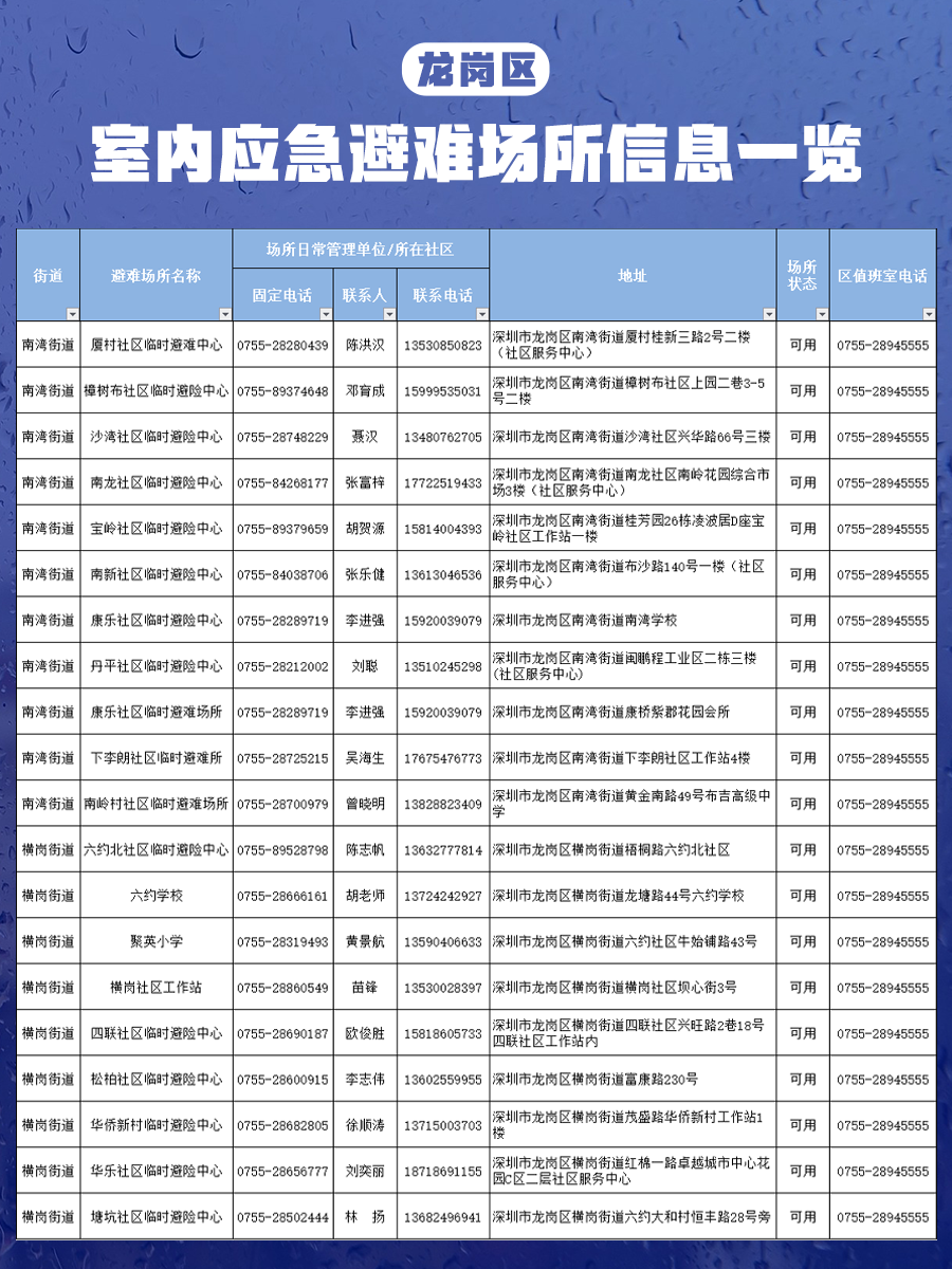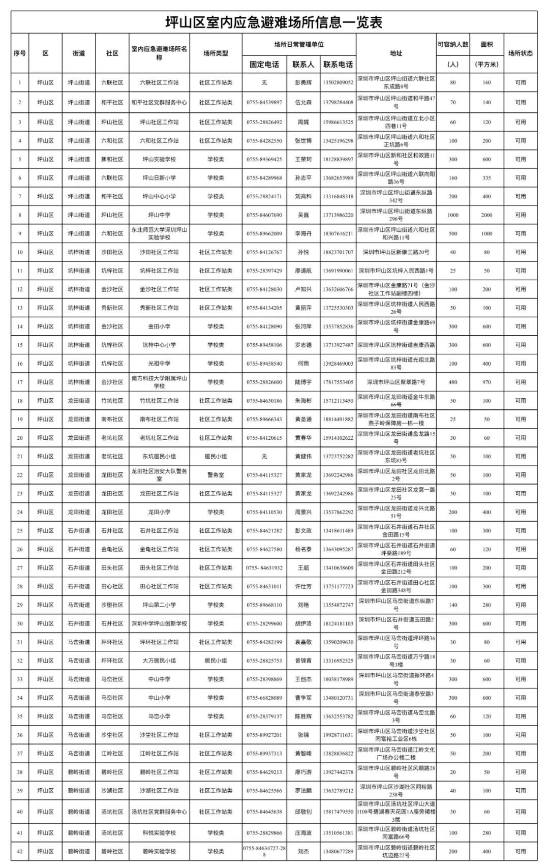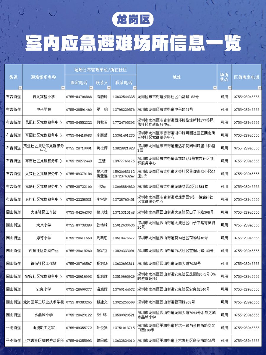 2025年,全市登记在册的室内应急避难场所为748处。部分场所因改(扩)建工程、内部装修改造等原因暂不适宜作为避难场所使用,实际可用的室内应急避难场所为688处。同时,按照属地管理原则,各区(含大鹏新区、深汕特别合作区)协调指定临时室内避险场所177处。详见链接《深圳市室内应急避难场所信息一览表》。