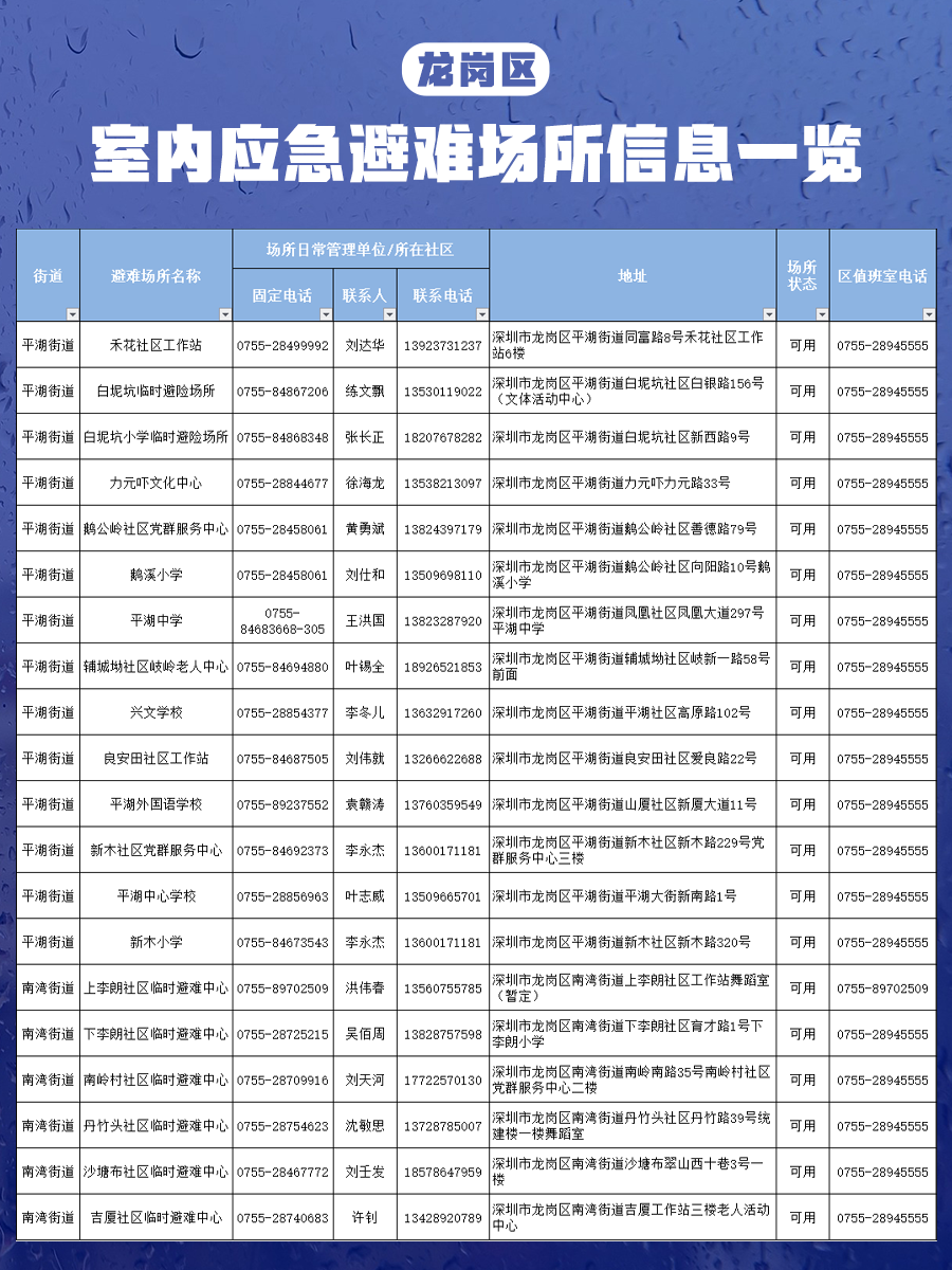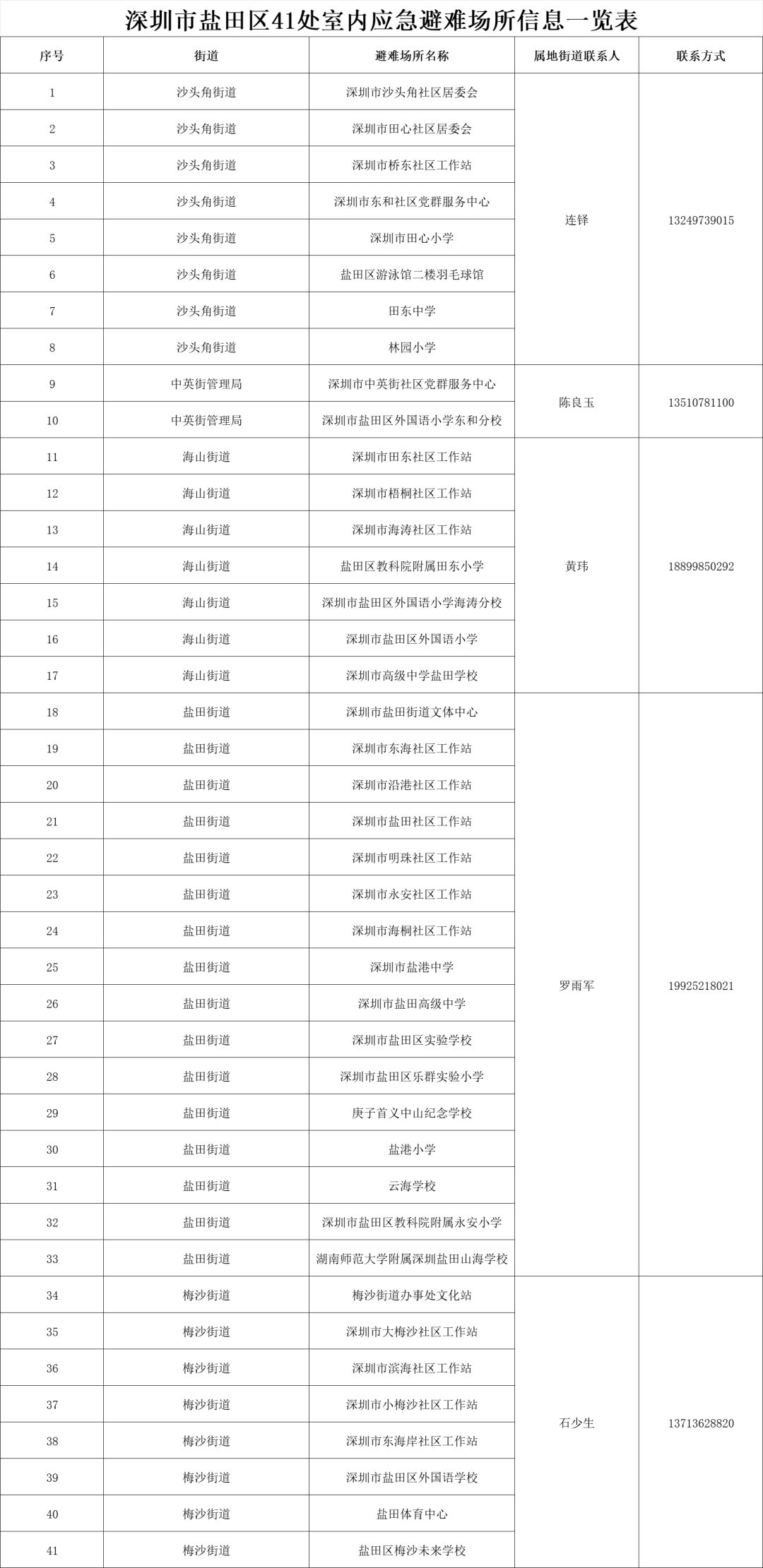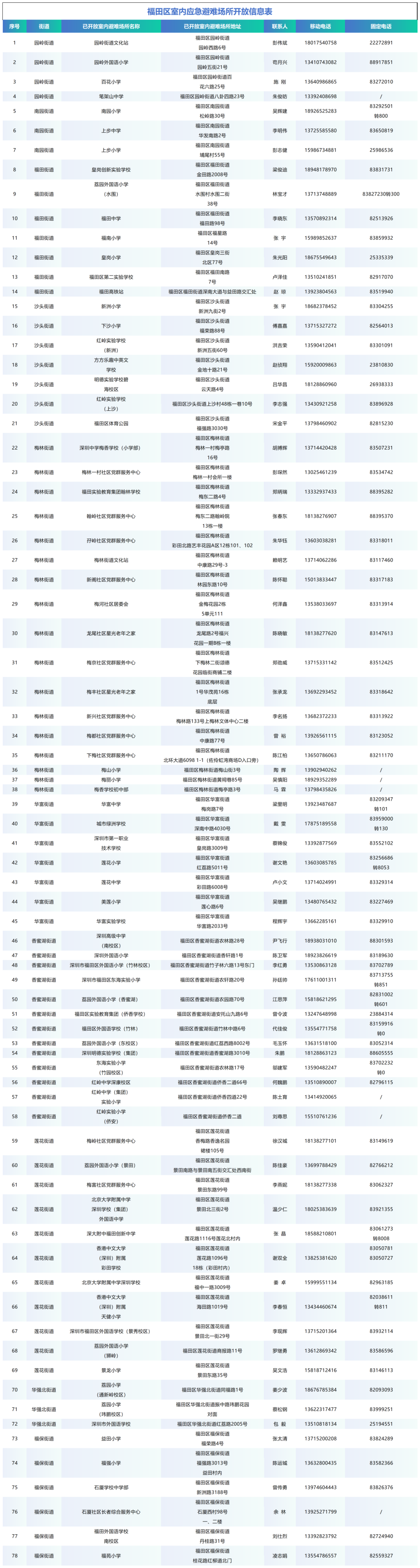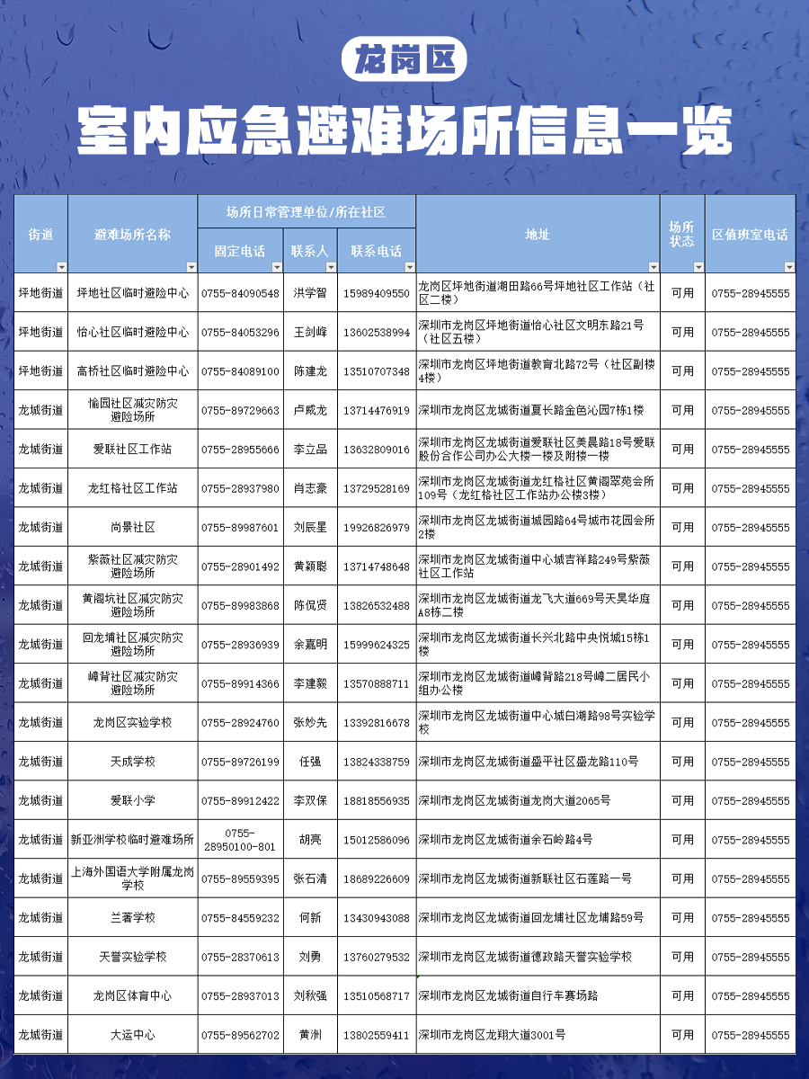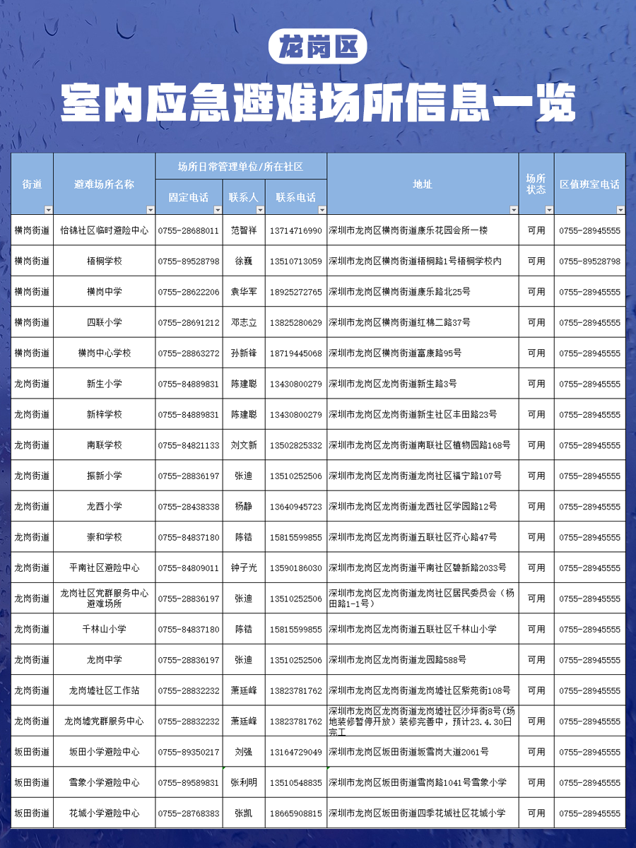 2025年,全市登记在册的室内应急避难场所为748处。部分场所因改(扩)建工程、内部装修改造等原因暂不适宜作为避难场所使用,实际可用的室内应急避难场所为688处。同时,按照属地管理原则,各区(含大鹏新区、深汕特别合作区)协调指定临时室内避险场所177处。详见链接《深圳市室内应急避难场所信息一览表》。