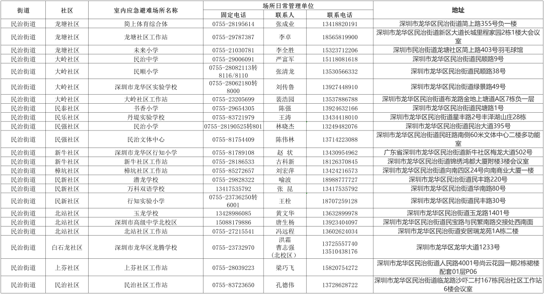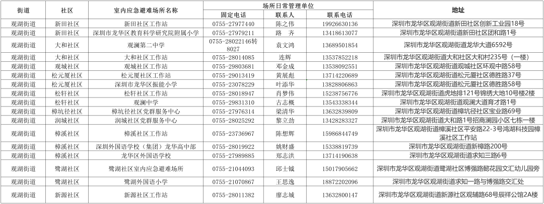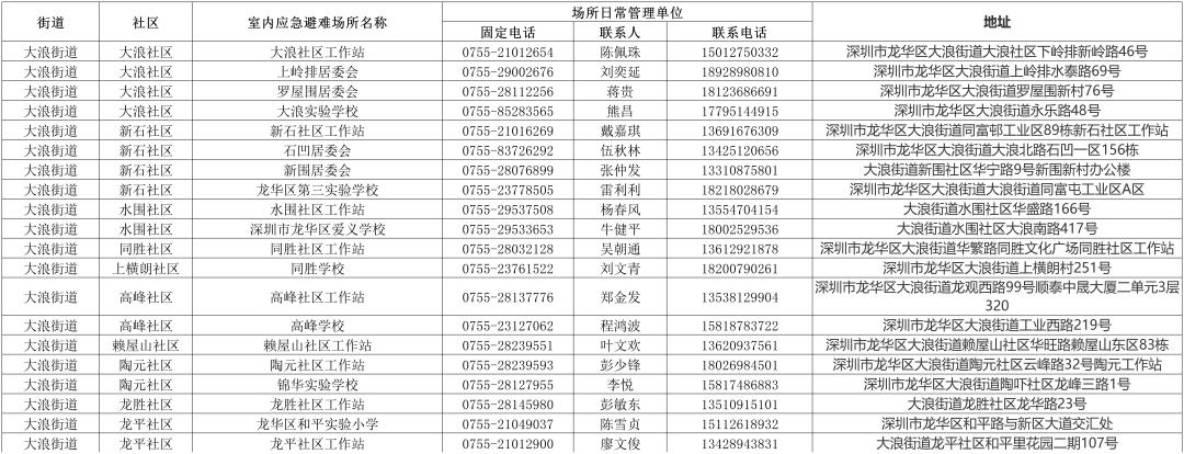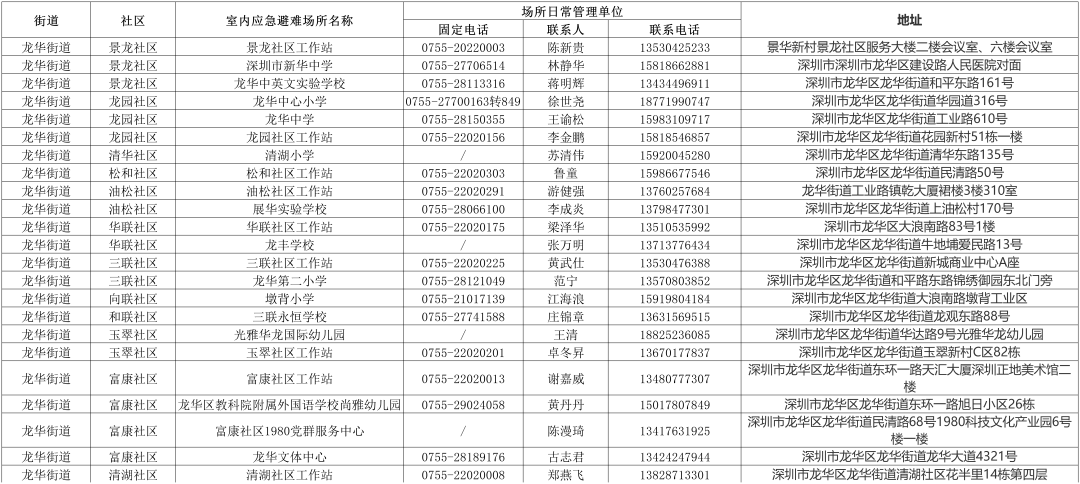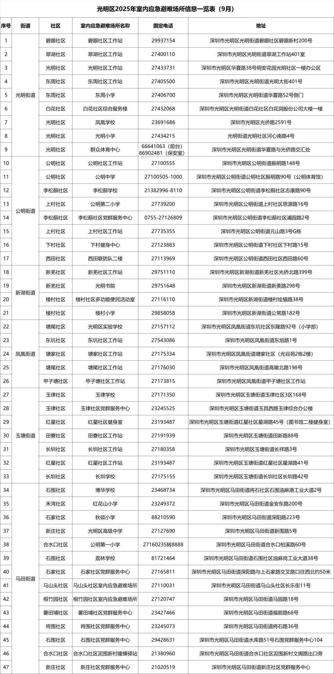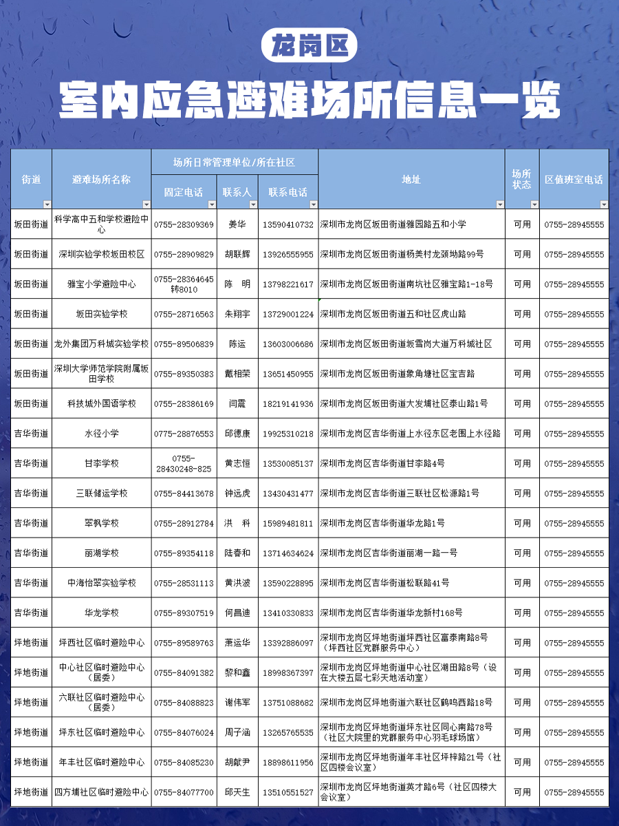 2025年,全市登记在册的室内应急避难场所为748处。部分场所因改(扩)建工程、内部装修改造等原因暂不适宜作为避难场所使用,实际可用的室内应急避难场所为688处。同时,按照属地管理原则,各区(含大鹏新区、深汕特别合作区)协调指定临时室内避险场所177处。详见链接《深圳市室内应急避难场所信息一览表》。