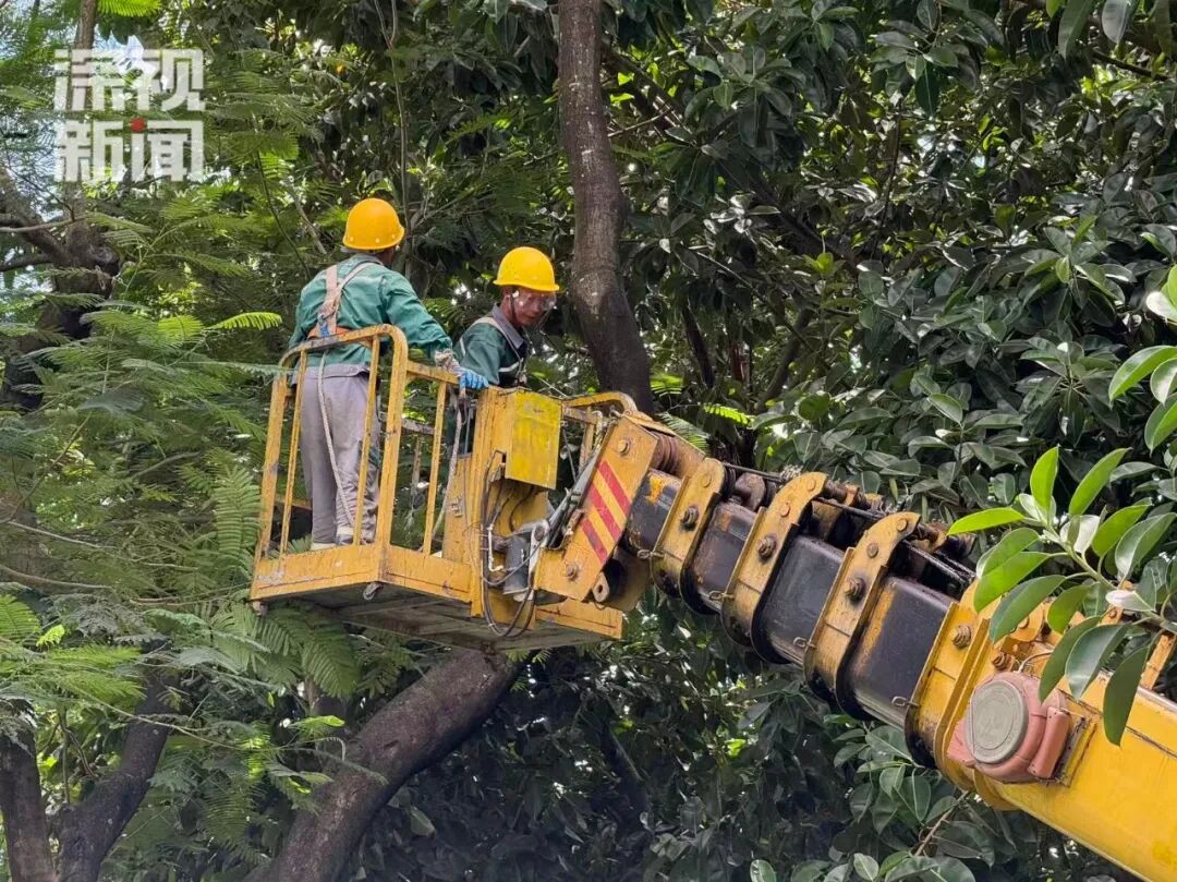 目前,供电人员加紧对全市输电、变电、配电设施周边开展特巡特维,重点排查关键线路及设备规定范围内铁皮房、塑料大棚、户外广告牌、横幅等外飘隐患,对辖区内电力线路通道附近的树木、竹林等易倒伏、断枝的树障隐患进行清理修剪。