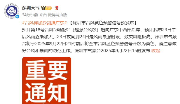 预计第18号台风“桦加沙”(超强台风级)趋向广东中西部沿岸,预计深圳市23日午后风雨逐渐加大,23日夜间到24日是风雨最强时段,致灾风险极高。深圳市气象台将于2025年9月22日21时前后将全市台风蓝色预警信号升级为黄色,请注意做好台风和暴雨的防范工作。