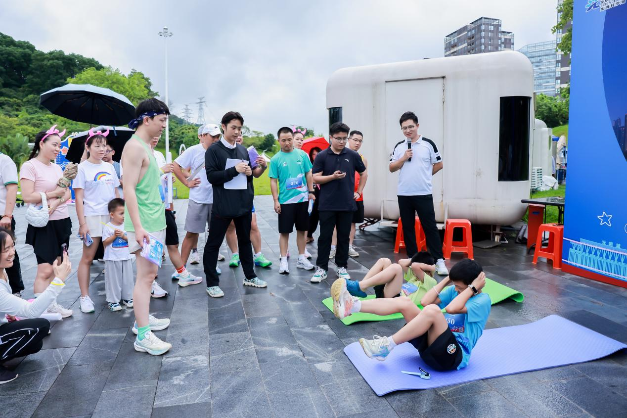 除了夜跑主赛事,现场设置的“光明记录”挑战赛同样人气爆棚。跳绳、仰卧单车等项目人头攒动,大家踊跃挑战区域运动纪录,欢声笑语此起彼伏。不少家庭全家上阵,父母带着孩子体验运动乐趣,温情满满。