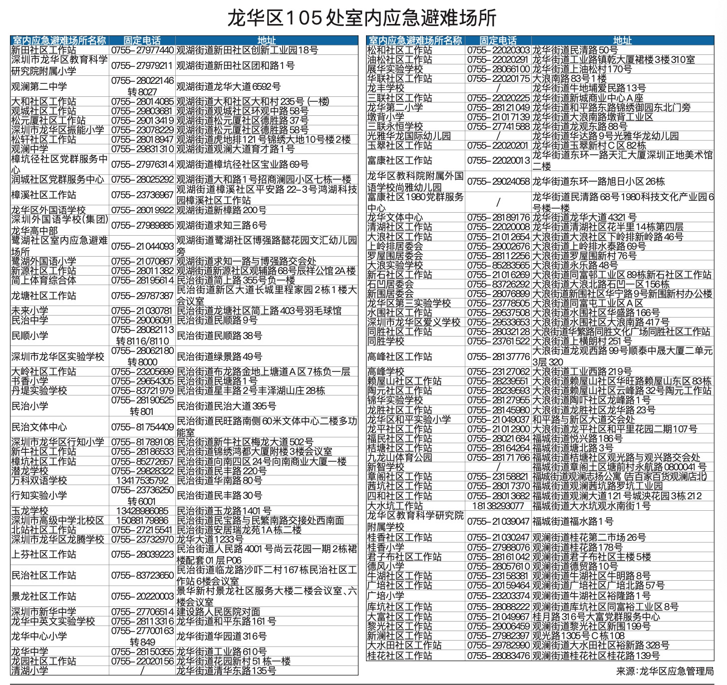 截至当前,龙华区累计建成室内应急避难场所112处,除去改扩建场所7处(民乐社区工作站、松和小学、深圳市龙华区龙澜学校、深圳市龙华区观澜第二小学、碧澜外国语小学、凹背居委会、观澜中心学校),当前可开放使用的室内应急避难场所105处,可用有效避难面积共约5.044万平方米,可容纳人数共1.918万人。
