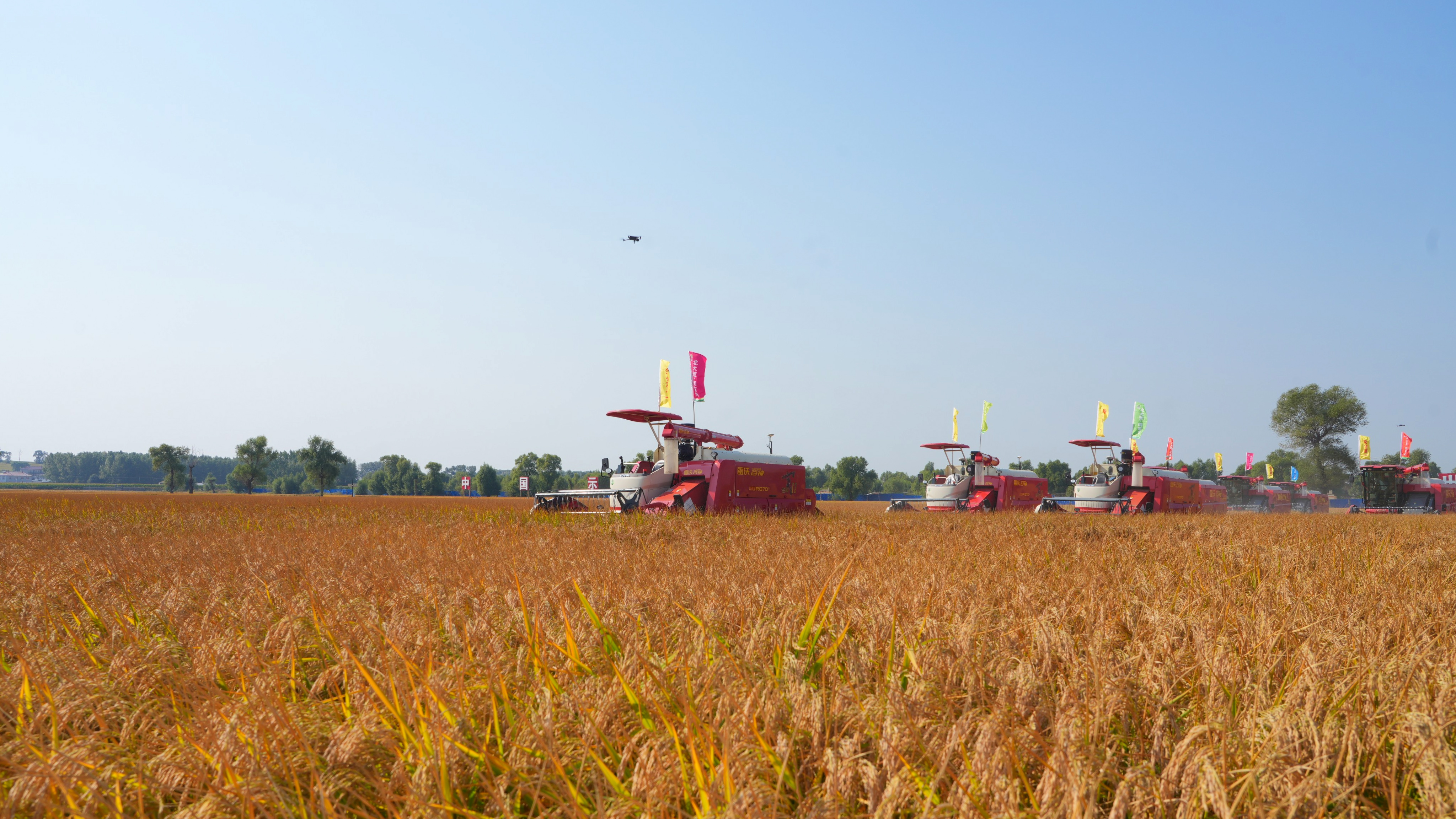 “迎丰收”“庆丰收”“乐丰收”,不同的形式,都直奔丰收的主题。活动现场,俨然是农业丰收的“晒”场,农民欢乐的海洋。一声“开镰啦!”9台大型水稻收割机轰鸣作响,列队驶入金色的稻海,齿轮滚动,精准地切割、脱粒,将一串串沉甸甸的稻穗收入“囊”中。