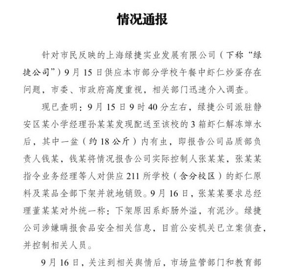 9月23日,记者获悉,针对市民反映的上海绿捷实业发展有限公司(下称“绿捷公司”)9月15日供应上海市部分学校午餐中虾仁炒蛋存在问题,相关部门介入调查,上海市公安局、上海市市场监督管理局、上海市教育委员会发布情况通报。👉新闻详情