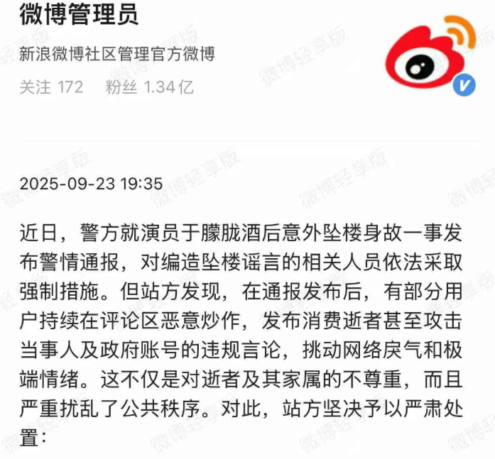 微博:恶意炒作于朦胧坠楼身故一事,1000余个账号被禁言或关闭
