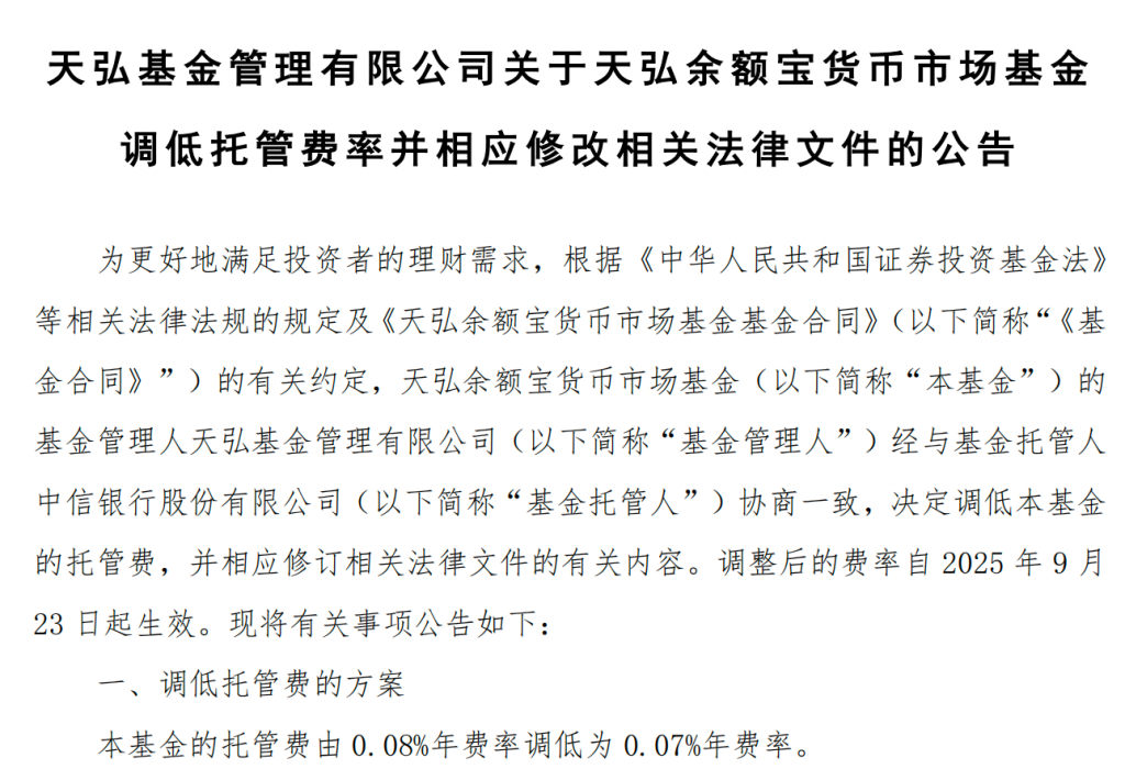 成立12年来首次降费,天弘余额宝宣布托管费下调0.01%