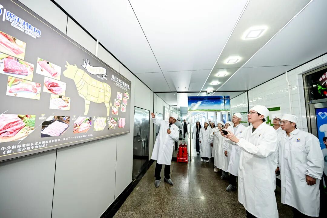 看过航空航天工业的高精尖,采访团于下午来到了吉林省长春皓月清真肉业股份有限公司(简称“皓月集团”),参观皓月示范养殖基地、肉用品种公牛展示区、生产中心、皓月创研中心、皓月产品中心等,考察了一头牛从牧场到餐桌的全过程。皓月集团,是亚洲知名的牛肉生产和进出口贸易基地,肉牛年屠宰规模可达100万头、肉羊200万只,产品包括高档沃金和牛、优质冷鲜牛肉、熟食深加工、中西餐饮产品、电商网红爆品、中高档进口产品、大健康产品、饲料、皮革和有机肥等十余系列1000多种,累计出口20多个国家和地区。依托科技赋能与产业链整合,皓月集团已形成了肉牛养殖、反刍饲料、食品加工、生物大健康、制革和有机肥等六大产业为核心的肉牛全产业链。