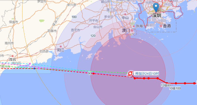 据最新台风动态,9月24日7时,今年第18号台风“桦加沙”(超强台风级)中心位于深圳偏南方150公里的海面上,中心附近最大风力16级(55米/秒),中心最低气压930百帕,七级风圈半径250~380公里,十级风圈半径150公里,十二级风圈半径90公里。预计“桦加沙”将以20~25公里/小时的速度偏西方向移动,强度维持或略有减弱,继续趋向江门台山至湛江沿海一带。