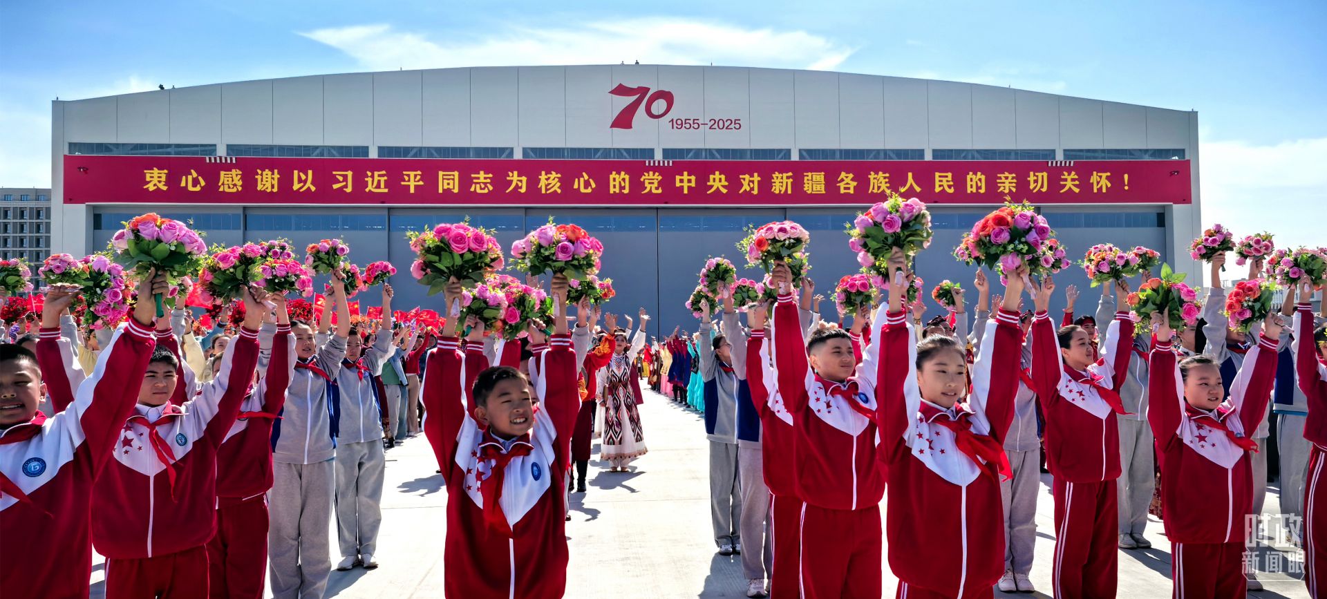 金秋时节,晴空万里。新疆各族群众热情迎接习近平总书记和中央代表团的到来。