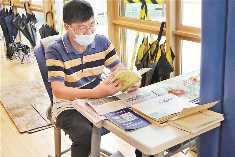 田寮社区安置点一位居民在“图书角”阅读时说: