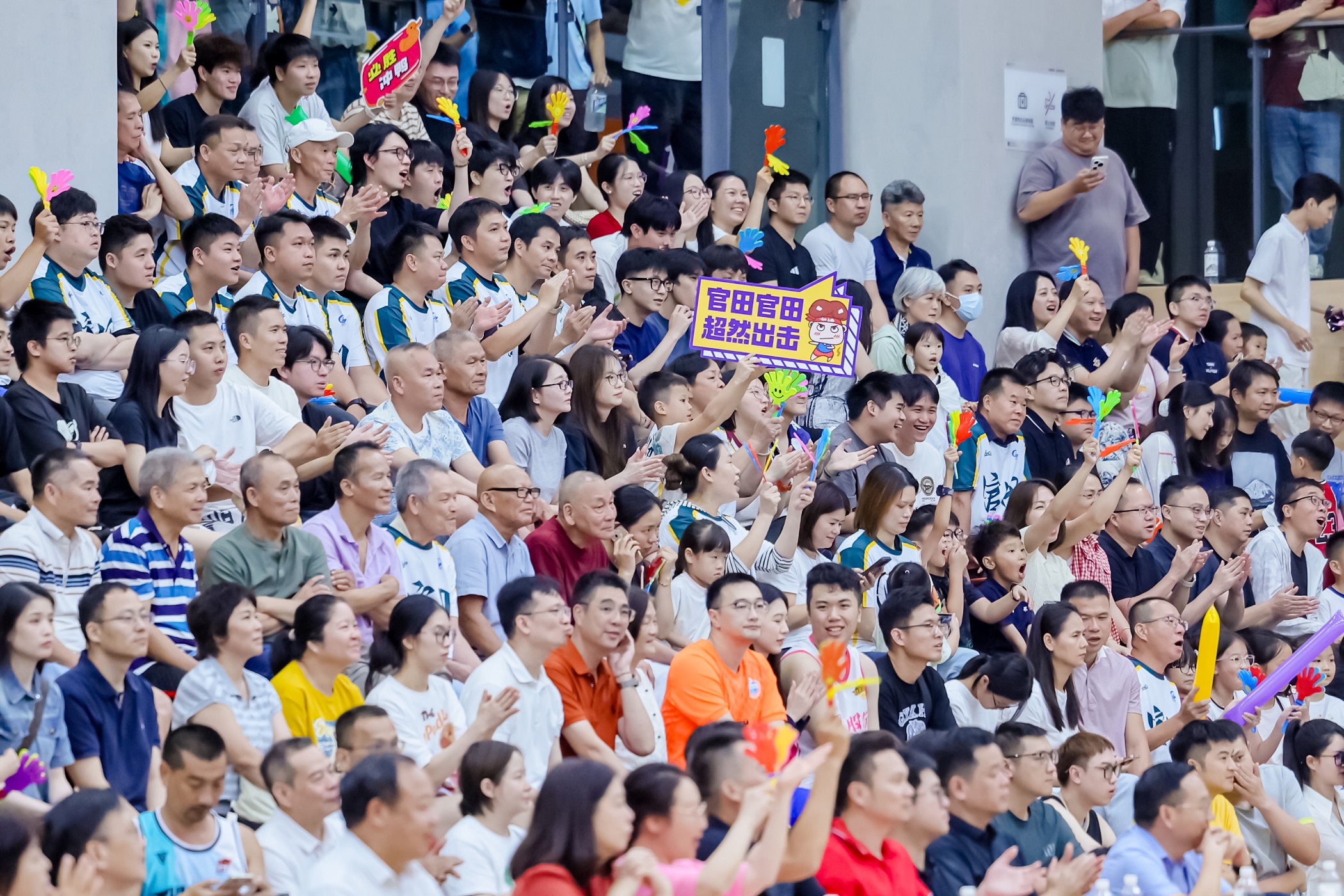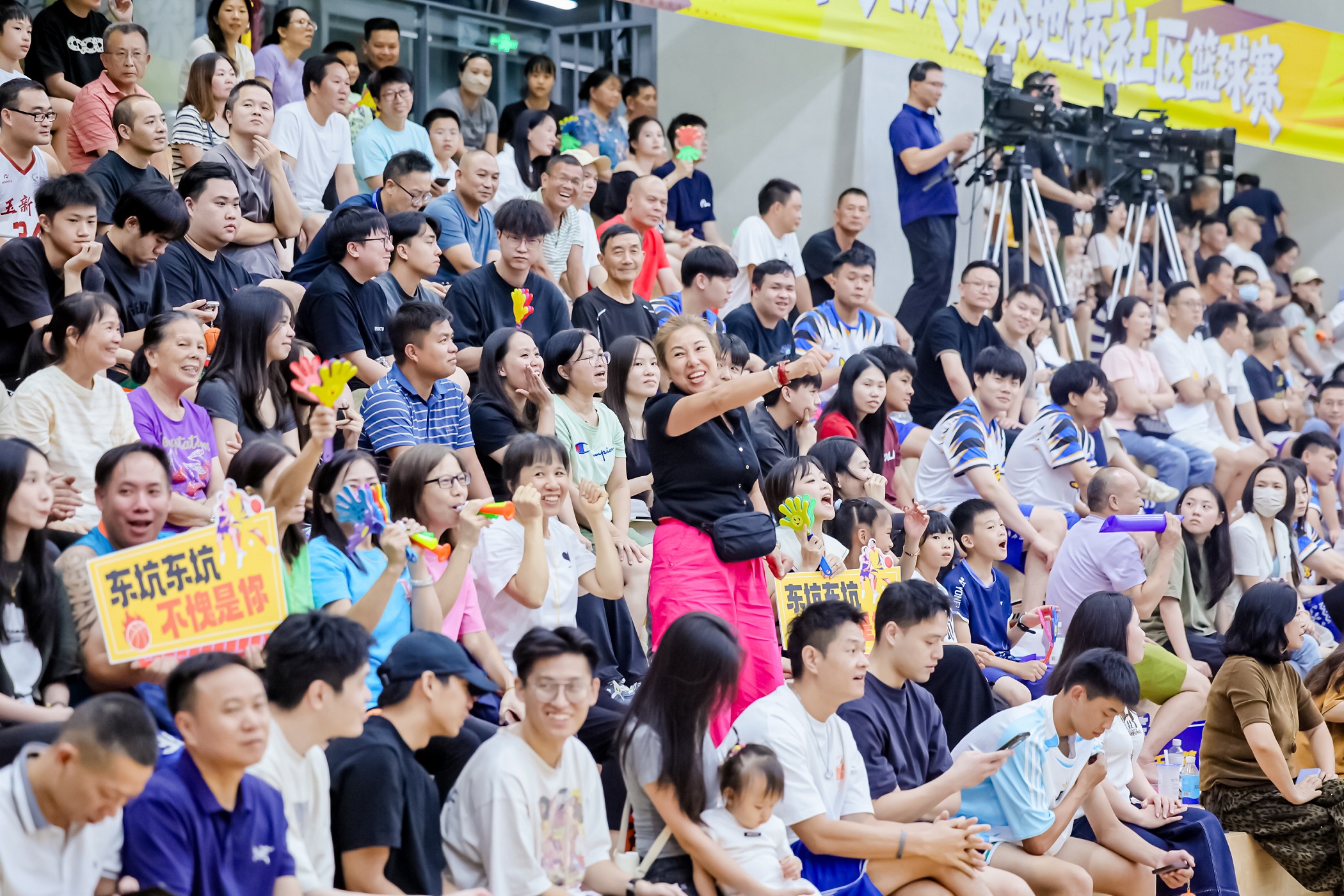 在比赛中,最让人印象深刻的,不仅仅是赛场上激烈的拼杀,还有看台上热情的加油呐喊声。官田社区的街坊们组团赶来,大鼓和铜镲,锵锵作响,鼓点激昂;东坑的居民也不甘示弱,在场下挥舞着自制的横幅、呐喊助威,整个场馆被热情点燃,变成了一个属于社区居民的狂欢广场。