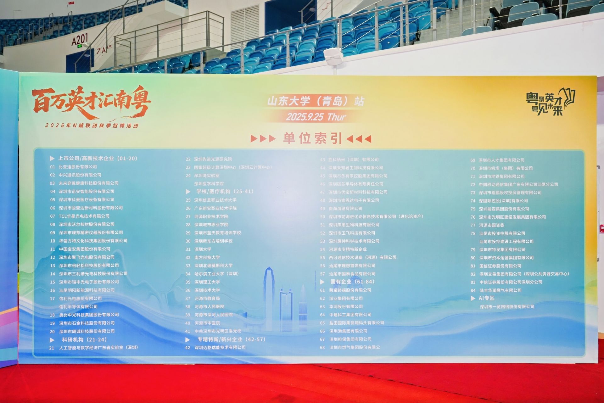 9月25日,由教育部和广东省委、省政府联合举办的“百万英才汇南粤”2025年N城联动秋季招聘活动(山东地区)首场招聘会在山东大学(青岛校区)举行。深圳市委常委、市政府党组成员陈清,广东省人力资源和社会保障厅二级巡视员刘剑莉参加活动并与学生面对面交流。