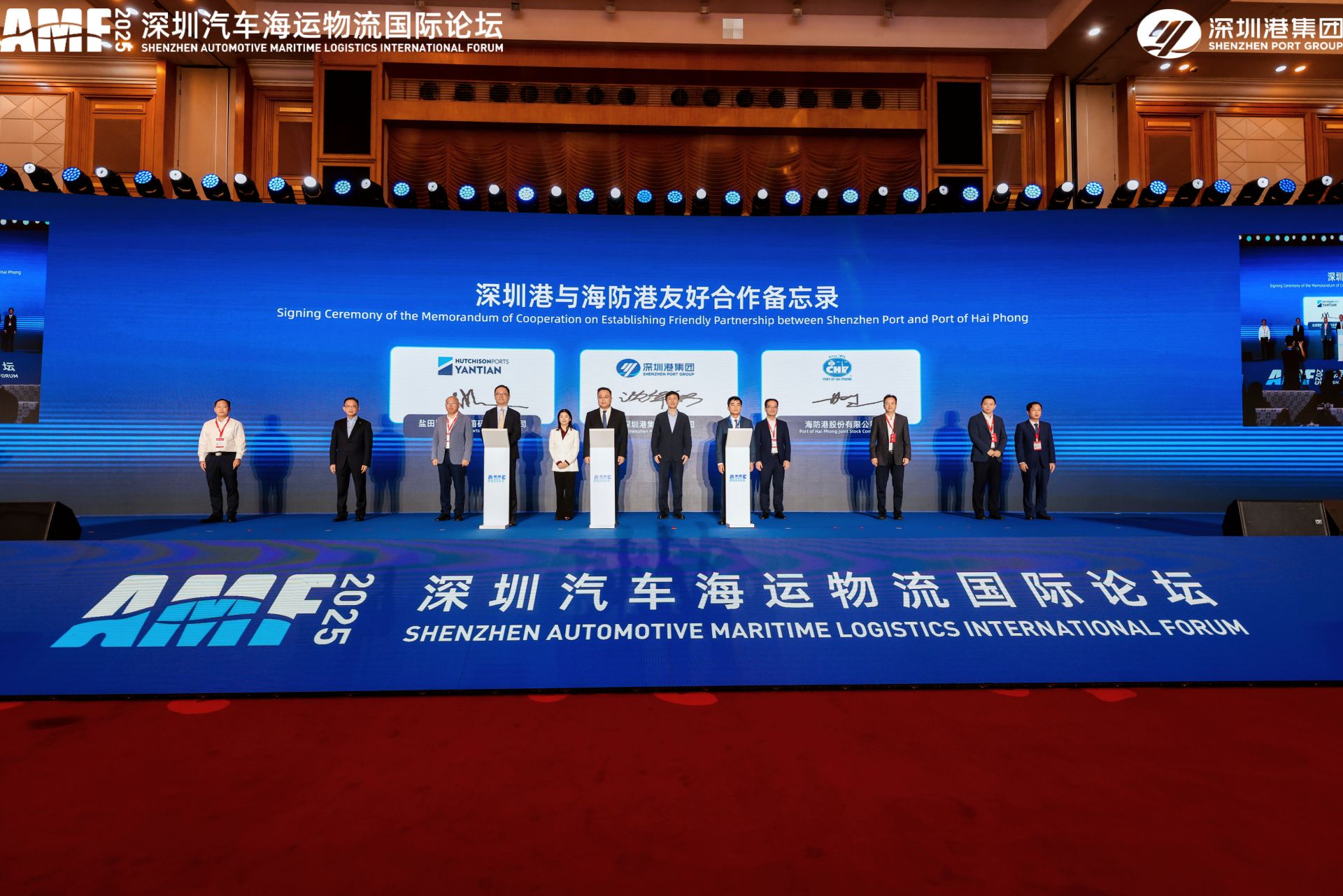 论坛现场深圳港集团及旗下企业与盐田国际集装箱码头有限公司、越南海防港股份公司、中远海运集装箱运输有限公司、中远海运物流供应链(华南)区域公司、中交第四航务工程局有限公司、北汽福田汽车股份有限公司、北京北汽鹏龙汽车服务贸易股份有限公司等行业龙头企业达成近10项战略合作,覆盖港口协同、汽车物流、贸易航运等多个领域,着力构建“资源共享、合作共赢”体系。论坛发布《深圳汽车滚装外贸枢纽港合作倡议》,提出打造“智慧高效、绿色低碳、全球协同”的汽车滚装枢纽港,推动深圳港从传统装卸港向全球综合航运枢纽转变。