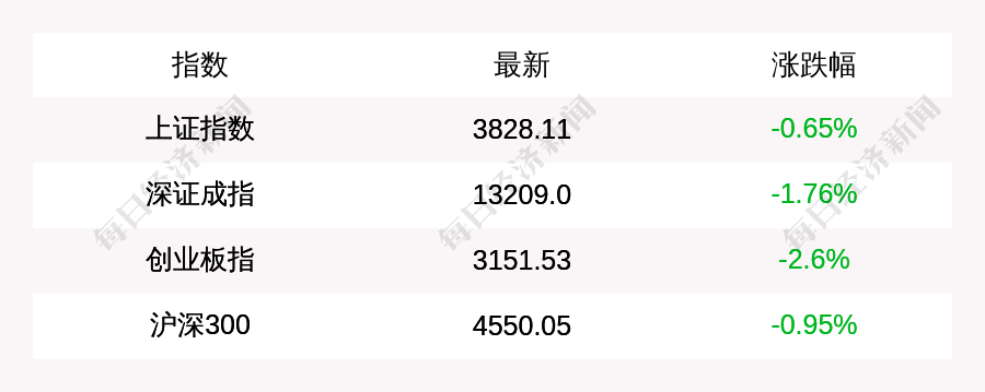 9月26日15:00,上证指数收盘下跌25.19点,跌幅为0.65%,报收3828.11点,成交额9278.65亿元;深证成指收盘下跌236.9点,跌幅为1.76%,报收13209.0点,成交额12190.25亿元;创业板指收盘下跌84.23点,跌幅为2.6%,报收3151.53点,成交额5702.35亿元;沪深300收盘下跌43.44点,跌幅为0.95%,报收4550.05点,成交额5987.24亿元。沪深两市成交额约21468.9亿元,较前一个交易日缩量约2242.06亿元。全市场1805只股票上涨、3414只股票下跌,其中58只涨停、24只跌停。