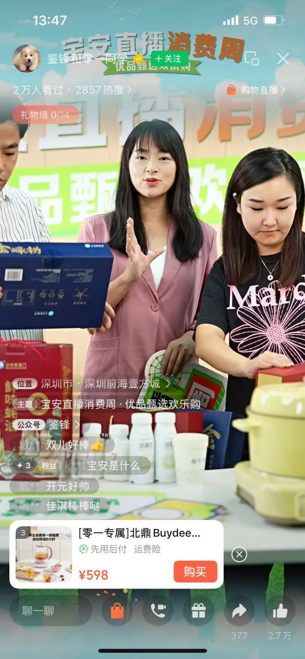 9月25日12时,2025年“点亮产业·宝安优品·梦甄选”直播消费周在宝安区网联会执行会长的直播间准时“开播”,约50款宝安数码、家居、食品、文旅产品相继亮相视频号、抖音平台直播间,以超优价格与网友见面,创造了新品牌“净姐”销售“爆单”等好成绩。
