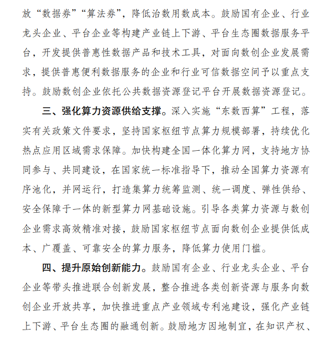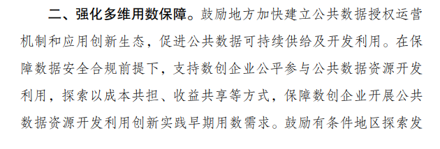 强化多维用数保障。鼓励地方加快建立公共数据授权运营机制和应用创新生态,促进公共数据可持续供给及开发利用。在保障数据安全合规前提下,支持数创企业公平参与公共数据资源开发利用,探索以成本共担、收益共享等方式,保障数创企业开展公共数据资源开发利用创新实践早期用数需求。鼓励有条件地区探索发放“数据券”“算法券”,降低治数用数成本。鼓励国有企业、行业龙头企业、平台企业等构建产业链上下游、平台生态圈数据服务平台,开发提供普惠性数据产品和技术工具,对面向数创企业发展需求,提供普惠便利数据服务的企业和行业可信数据空间予以重点支持。鼓励数创企业依托公共数据资源登记平台开展数据资源登记。