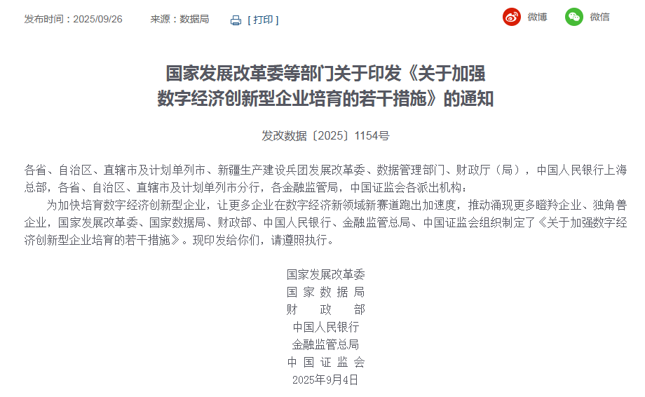 国家发展改革委、国家数据局、财政部、中国人民银行、金融监管总局、中国证监会印发《关于加强数字经济创新型企业培育的若干措施》来看重点内容: