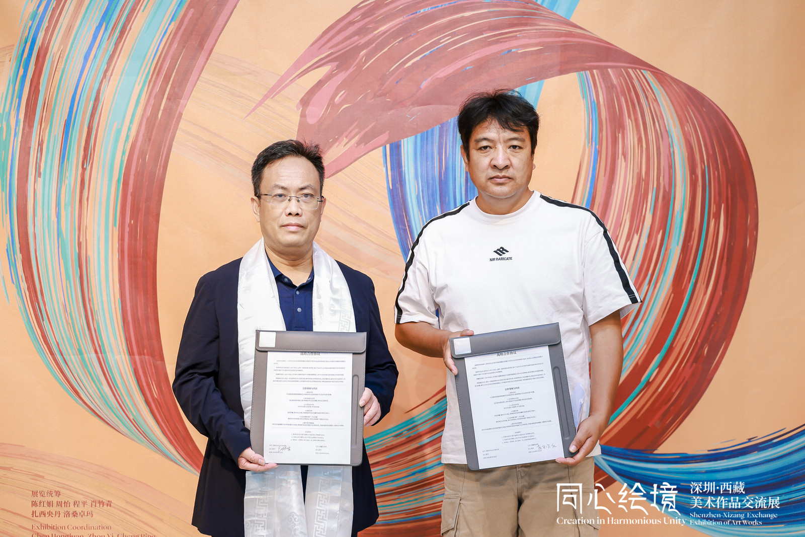在开幕式上,深圳市关山月美术馆和西藏美术馆签订五年战略合作协议,双方在展览交流、学术研究、人员互访、数字美术馆建设等方面展开深度合作,促进两地艺术文化的交流、融合和发展,实现优势互补,活化馆藏作品,推动艺术作品的展示、交流与传播。