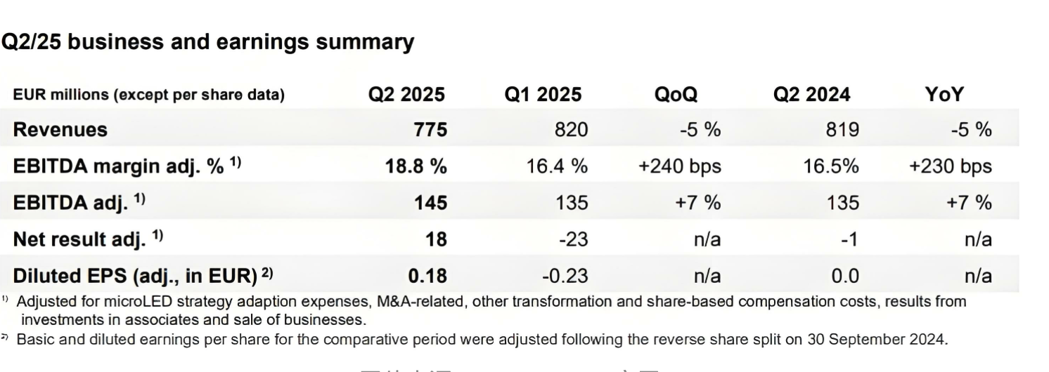 2025年第二季度,艾迈斯欧司朗实现营收7.75亿欧元,符合此前7.25亿至8.25亿欧元的指引区间。若剔除汇率波动影响,核心业务收入仍实现约2%的同比增长。更值得关注的是盈利能力:调整后EBITDA达到1.45亿欧元,同比和环比均增长7%,利润率提升至18.8%,创下新高。