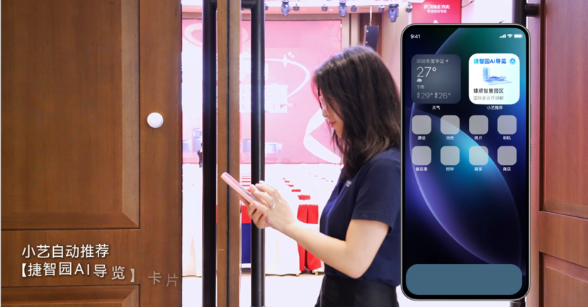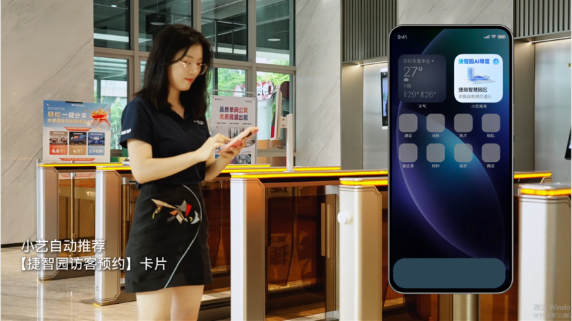 在捷顺科技智慧园区的场景中,招商接待、访客通行的场景对用户体验的要求是非常高的。比如园区访客来访和招商人员到园区考察时,基于鸿蒙原生AI导览技术,捷顺在智慧园区多个参观点设置了讲解内容,鸿蒙系统的用户途径参观点时,“小艺推荐”则出自动唤醒相应元服务卡片,让用户可以随时随地通过视频或图文等方式了解该参观点或租赁空间的详情。
