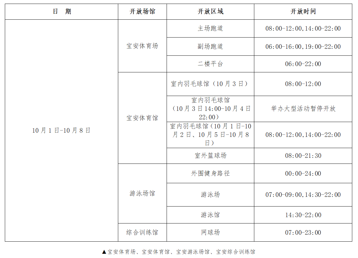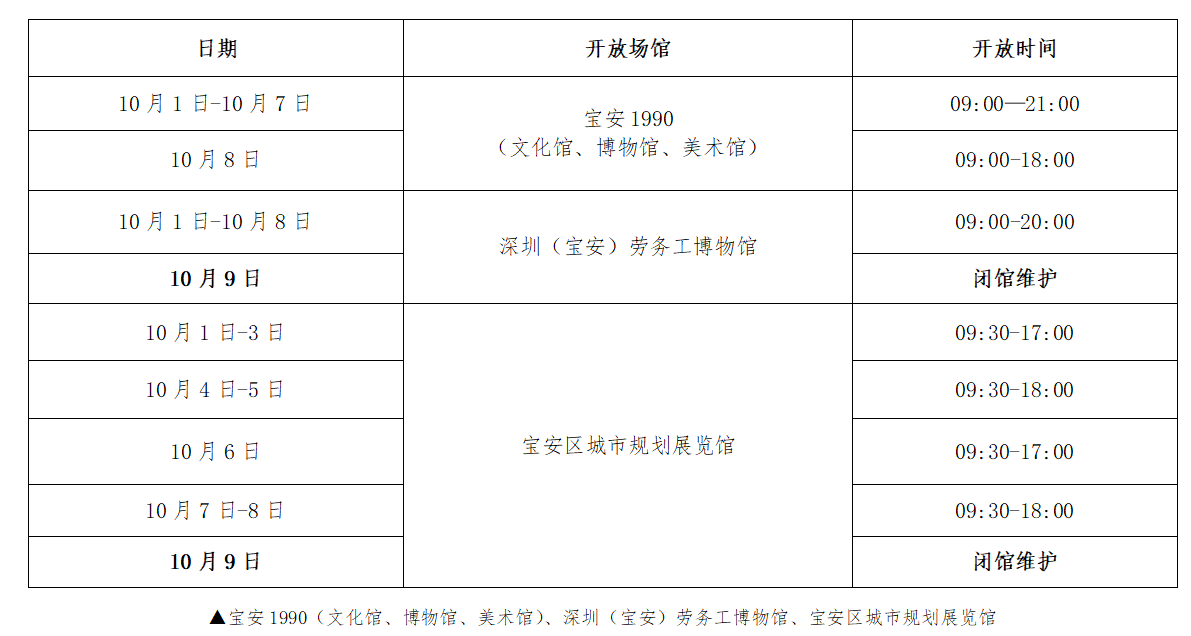 10月1日至8日国庆中秋双节期间,宝安区公共文化体育服务中心下辖场馆:宝安体育馆、宝安体育场、宝安游泳场馆、宝安综合训练馆、宝安1990(文化馆、美术馆、博物馆)、宝安区图书馆总分馆、宝安区城市规划展览馆、深圳(宝安)劳务工博物馆持续开放。宝安图书馆总馆及街道分馆、宝安区城市规划展览馆、深圳(宝安)劳务工博物馆等文化场馆将闭馆维护日调整至10月9日假期结束后。