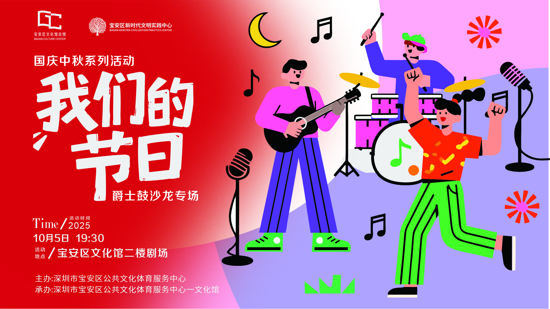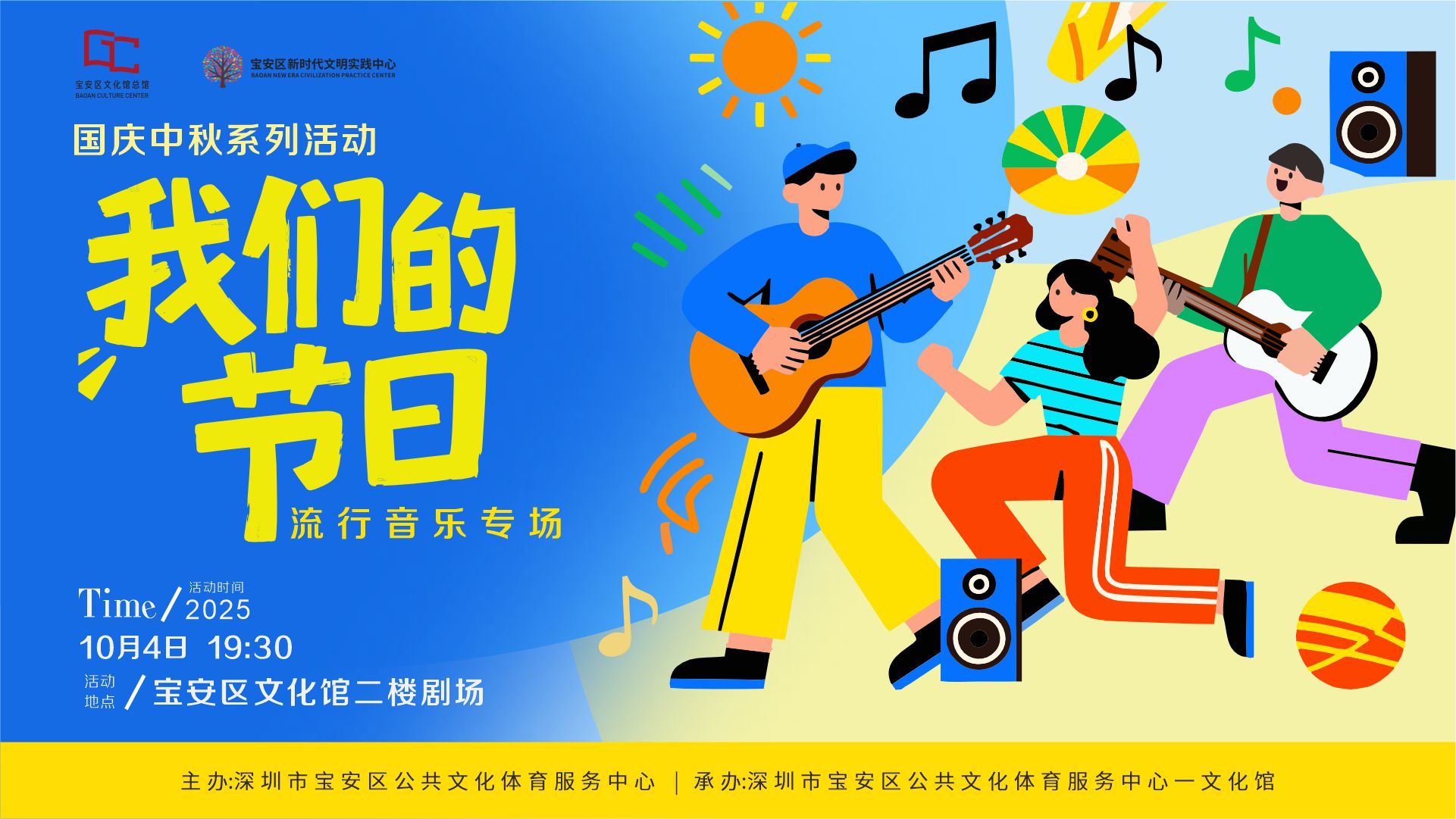 缤纷双节至,欢乐宝安行。为丰富市民假期文体生活,国庆中秋双节期间宝安区公共文化体育服务中心各文体场馆持续开放,并精心策划系列节庆文体惠民活动,涵盖艺术普及、文化体验、展览展示、亲子互动、非遗特色及体育健康六大领域,全力为市民打造一场精彩纷呈的“双节”文体盛宴。