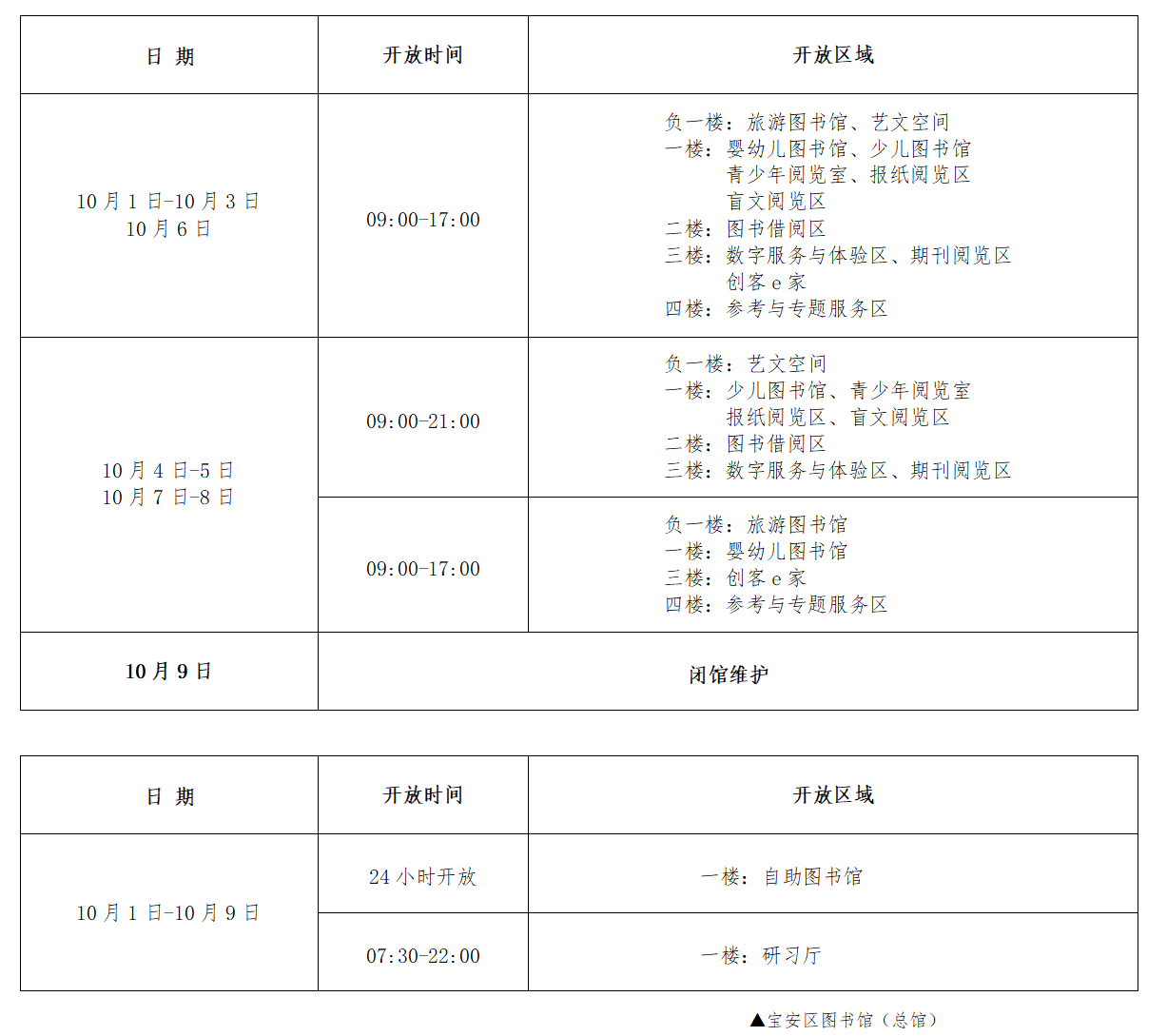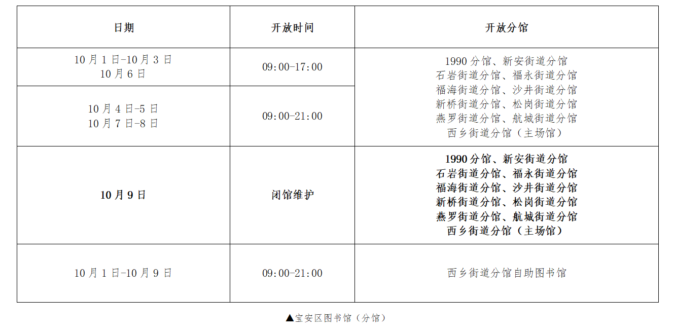 2.国庆节、中秋节假期期间,西乡流塘分馆、新安中洲分馆、新安兴东分馆、石岩汇裕名都分馆、石岩环湖碧道自助分馆及各社区阅读中心、服务点具体开放安排请留意各场馆外通知公告。