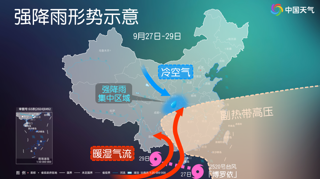 在北方,另一条雨带也已形成。27日至29日,受高空槽和冷空气影响,四川东部、重庆、陕西南部、湖北、河南、山东等地将有中到大雨,局地暴雨或大暴雨,强降雨核心区位于四川东北部和陕西南部。上述地区近期降水已偏多,需防范持续降雨可能引发的山洪、滑坡等灾害。