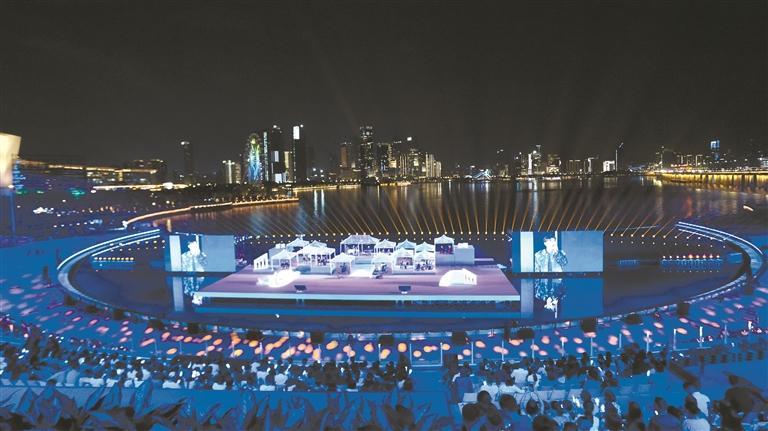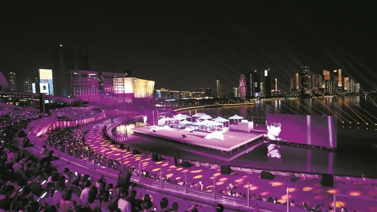 月光洒在波光粼粼的海面上,对岸都市夜景与浪漫的摩天轮勾勒出梦幻天际线——这并非刻意搭建的舞台背景,而是欢乐剧场与生俱来的天然画卷。作为深圳市重点打造的文化新地标,欢乐剧场设计理念为“同心共享 潮起前海 舞动湾区”,以固定看台、超大水上舞台为核心,配以艺术互动区和临海休闲空间,创新打造“演艺+”复合型文化平台。