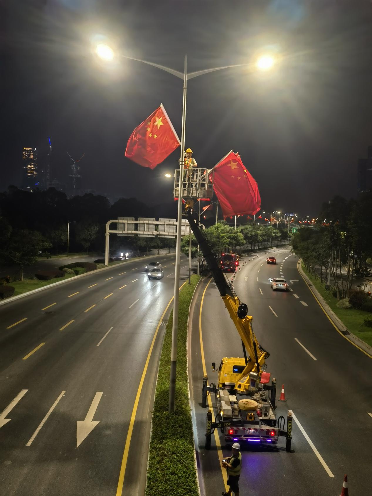 如今已有超过4600面国旗在主要干道上迎风招展。工人们细心地将一面面国旗安装在路灯杆上,确保整齐划一、牢固美观。每一面悬挂好的国旗,不仅是一道风景,更是一份对祖国的深情祝福。
