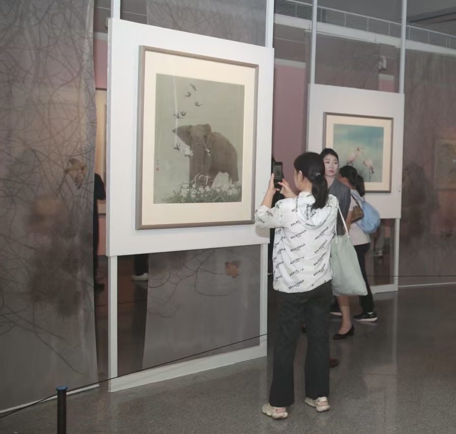 跟随景丽莉的笔触,我们远离喧嚣,步入一个静谧而充满灵性的世界。她的灵感源自远行采风中的每一次感动与邂逅。画中是触手可及的生命温情:憨态可掬的小象、从容翩然的火烈鸟、守护鸟巢的犀鸟……这些生灵日常中静谧而珍贵的瞬间,被她以极致精微的工笔细心捕捉。