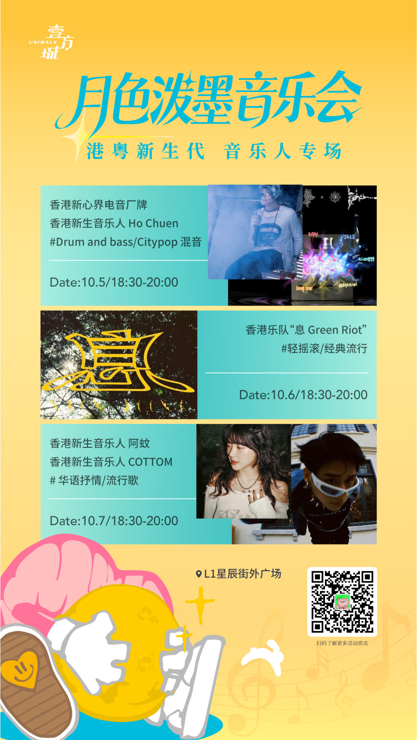 中秋节期间,前海壹方城又切换为“浪漫模式”!10月5日至7日,L1星辰街外广场的“月色泼墨音乐会”将震撼上演——4.5米高的泼墨月亮在灯光下泛着柔和光晕,邀您与月亮同框合影!晚风伴着多样音乐,中秋氛围感直接拉满!且每日演出主题各不相同:10月5日,香港新心界电音厂牌与香港新生音乐人Ho Chuen联合驻场,浪漫摇滚嗨翻全场;10月6日,香港“息 Green Riot”乐队用熟悉旋律唤醒青春记忆;10月7日浪漫收官夜,前半场呈现民谣与文艺翻唱,后半场演绎华语抒情歌,用浪漫直击人心!