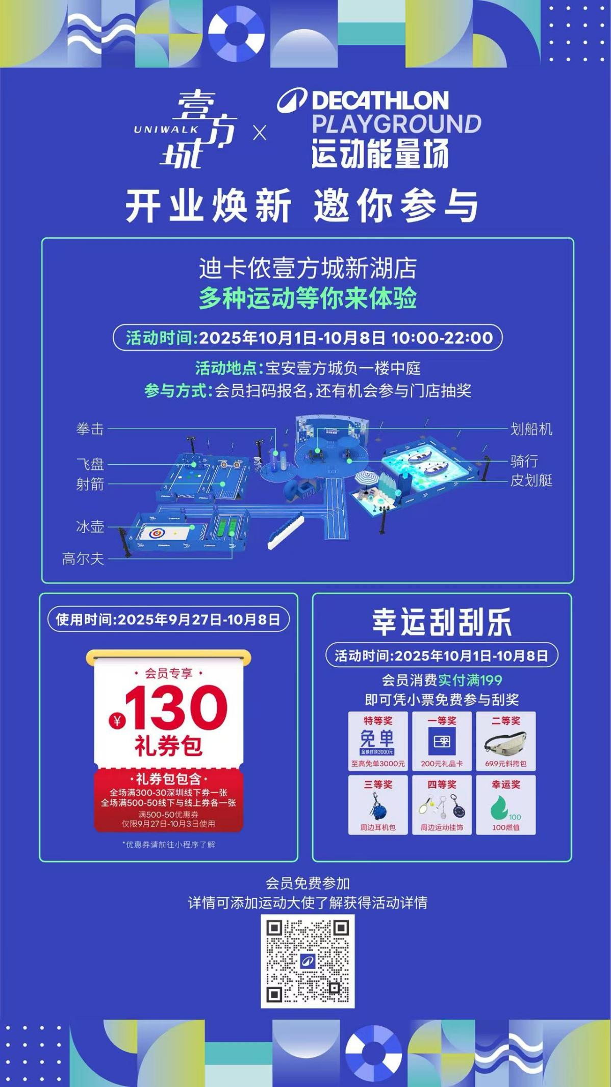除了科技展演、潮流活动与浪漫音乐,L1地铁广场设有“我爱中国”打卡点,您可与国旗合影,为祖国庆生;二次元爱好者别错过B2捣谷岛谷的“星河织梦・沈星回生贺痛岛”活动,10月1日至16日,大屏展示、花墙布景、周边领取等环节,满足您的次元梦想;运动爱好者也有专属娱乐区:B1中心广场的迪卡侬运动能量场将于10月1日正式开放,各类趣味运动项目一应俱全!此外,10月1日、2日,美丽宝可爱IP“小宝”将在L1层巡游,萌趣人偶挥着小手与路人互动、合影,“追星+购物”的双重快乐在此实现!