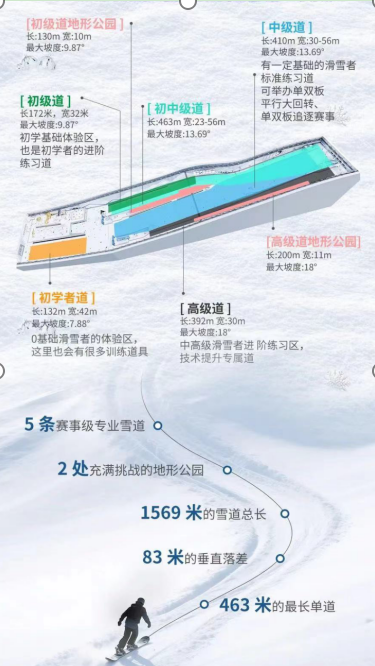 这座占地10万平方米的冰雪王国拥有5条专业雪道、单道最长463米,垂直落差83米,其中中级道和高级道获得国际雪联(FIS)专业认证,可承办高山滑雪回转类与平行回转类国际赛事。此外雪场还打造4000㎡冰雪乐园,设有14项青少年娱雪设施,能满足不同客群的冰雪体验需求,将成为粤港澳大湾区全新的旅游地标。试运营期间,所有滑雪区域全面开放,包含5条专业滑道、5条魔毯及2条缆车索道,设施完善,满足初、中、高级不同水平滑雪爱好者。