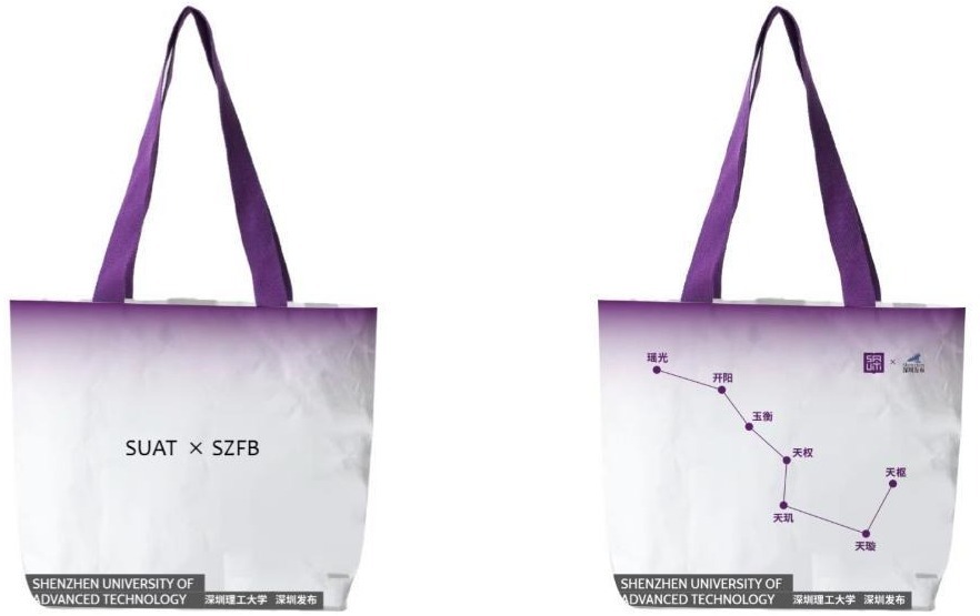 深圳理工大学校园里呈“北斗七星”状分布的建筑,分别命名为“瑶光、开阳、玉衡、天权、天玑、天璇、天枢”。记者看到,这款联名托特包,把“北斗七星”化作线性图案,印在白紫色包包上,背起它就像把整片星空背在身上。