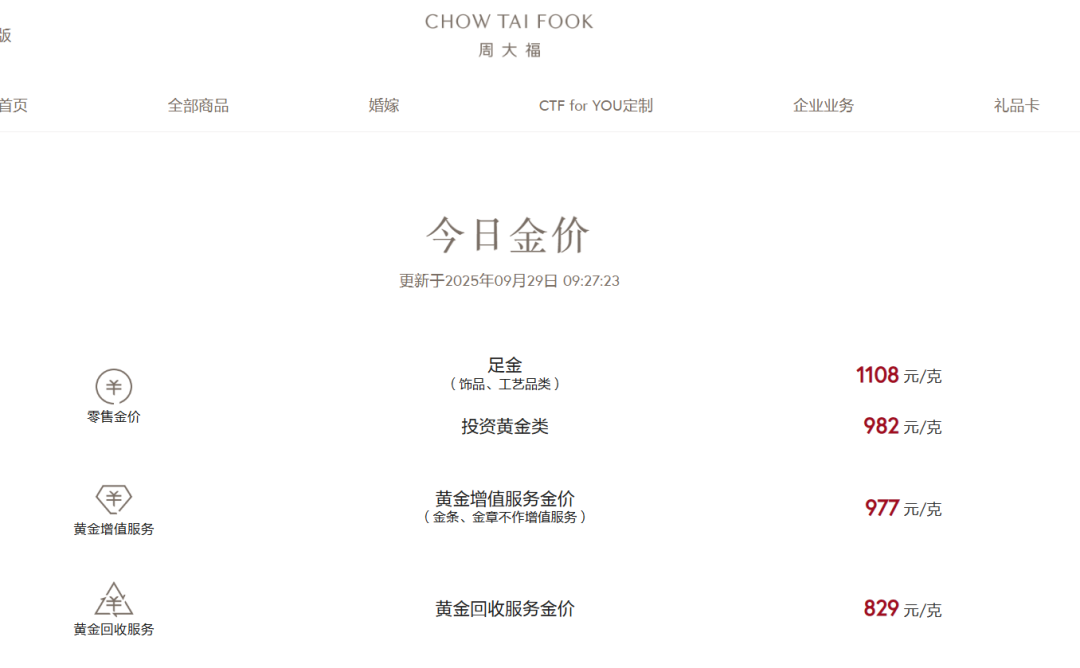9月28日,周大福、周生生、六福珠宝等品牌足金首饰报价1108元/克,周六福1070元/克,老凤祥、老庙黄金1100元/克。