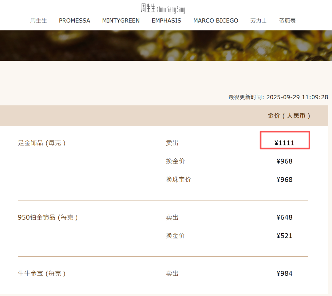 国内金饰价格方面,据品牌官网消息,周生生足金饰品价格报1111元/克,较9月26日上涨5元/克。周大福、六福珠宝等品牌足金首饰价格则维持在1108元/克不变。
