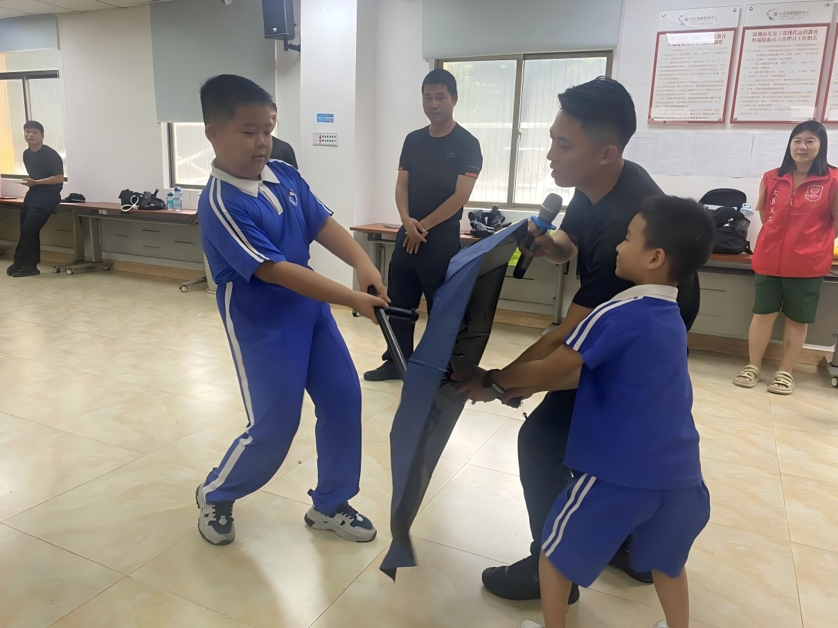 警察器械体验环节则充满趣味与实用价值。民警不仅展示了警棍、防爆钢叉、盾牌等专业警务器械,更结合“遭遇可疑人员尾随”“校园突发危险”等场景,创新传授实用防护技巧——教孩子们用书包、雨伞等拉开安全距离,让日常物品变身“应急防护工具”。“原来书包也能当‘盾牌’。”孩子们的兴奋溢于言表,快速掌握了贴近生活的自保方法。
