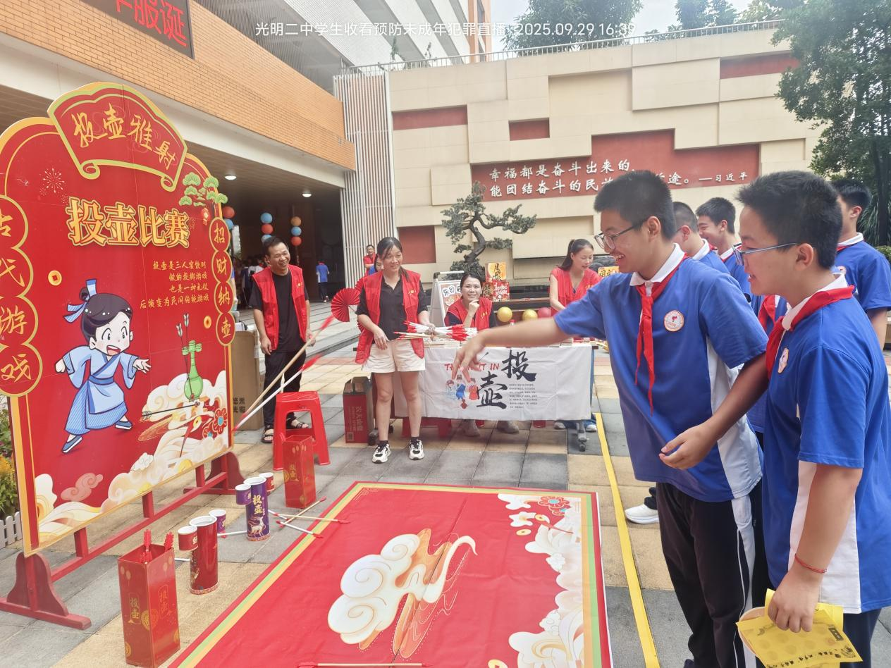游园会设置了十余个各具特色的传统文化体验摊位。从“投壶雅射”的古礼体验,到“巧手漆扇”的创意表达;从“慧猜灯谜”的知识比拼,到“朱砂启智”的启蒙仪式,每个摊位都是一扇通往中华优秀传统文化的窗口。学生们手持游园卡,在各个摊位间穿梭——或凝神思索灯谜谜底,或专注体验朱砂点痣,或小心翼翼投掷箭矢,在趣味互动中触摸传统技艺的温度,感受中华优秀传统文化的独特魅力。