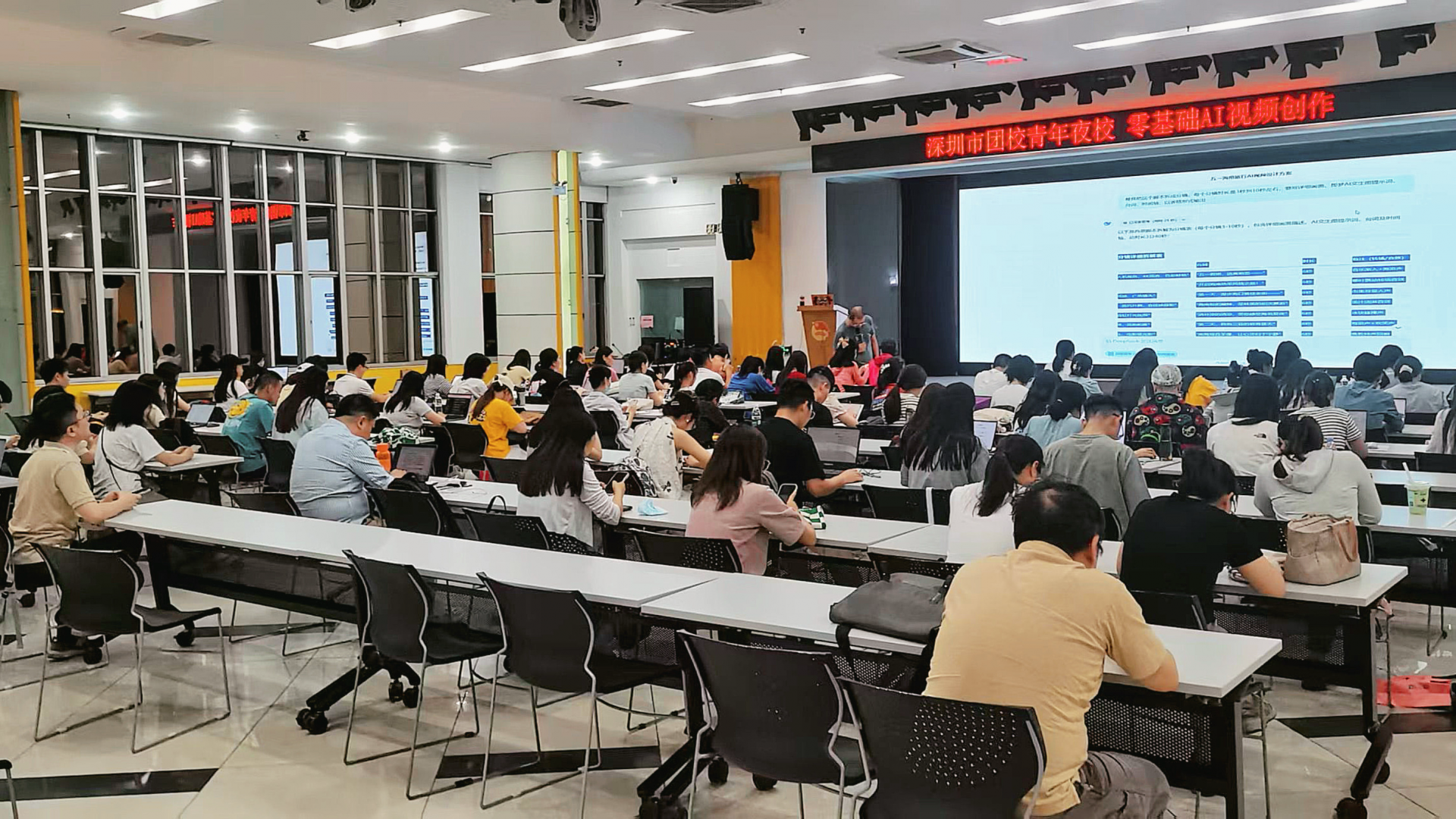 9月22日晚上7点半,在深圳一所中学担任特教老师的邓晨曦坐在市团校一楼的教室里,认真地聆听《虚拟形象智造:AIGC数字人应用》系列课程。教室里座无虚席,尽管忙碌了一整天,青年们仍求知若渴地坚持上课,看着老师在大屏幕上的演示,时不时提出操作上的疑问。“青年夜校是一个很好的获取知识的平台,下班时间再晚我也会赶过来,在这里‘充电’学到的知识又可以应用到工作和生活之中。”邓晨曦说。