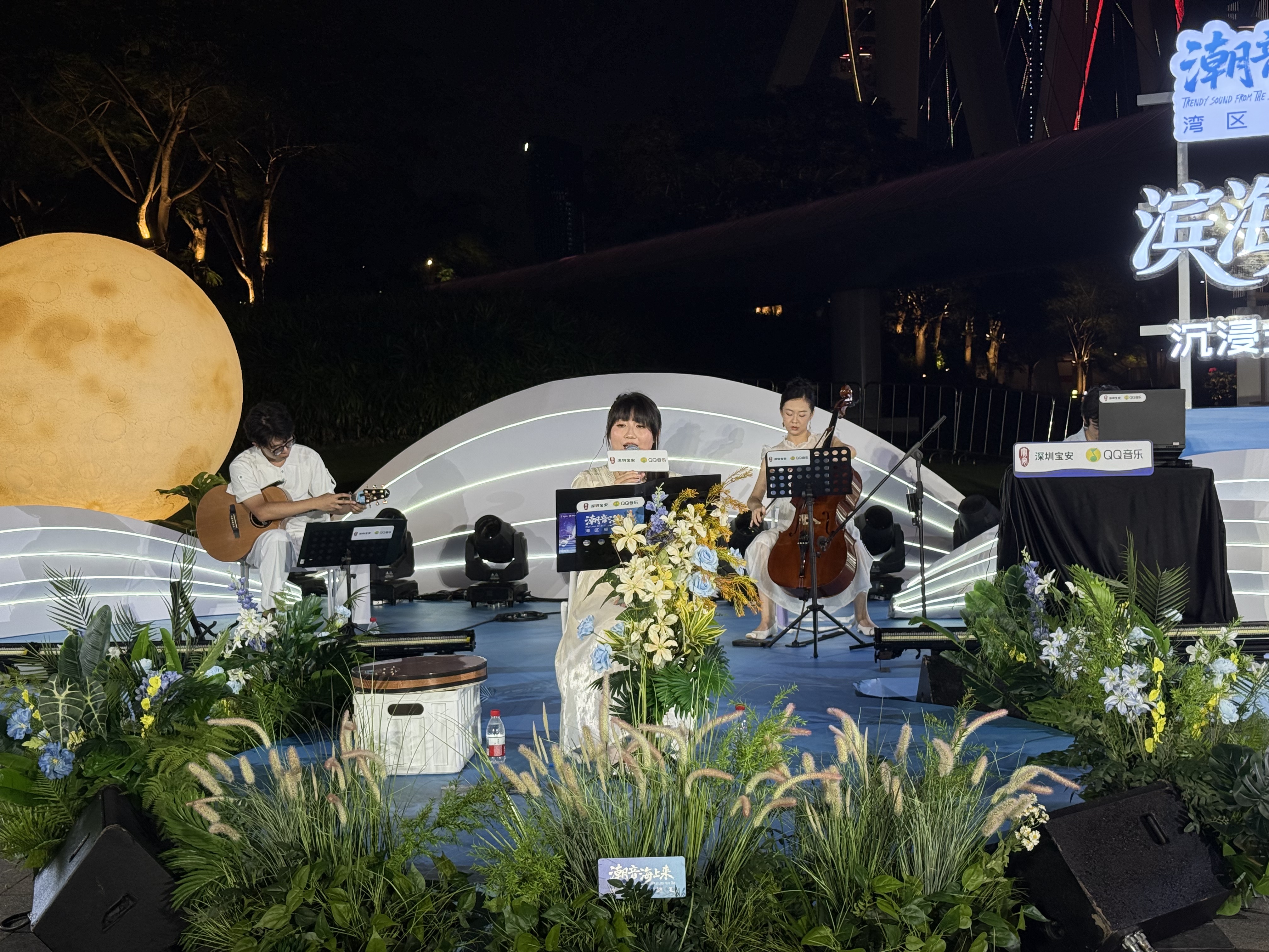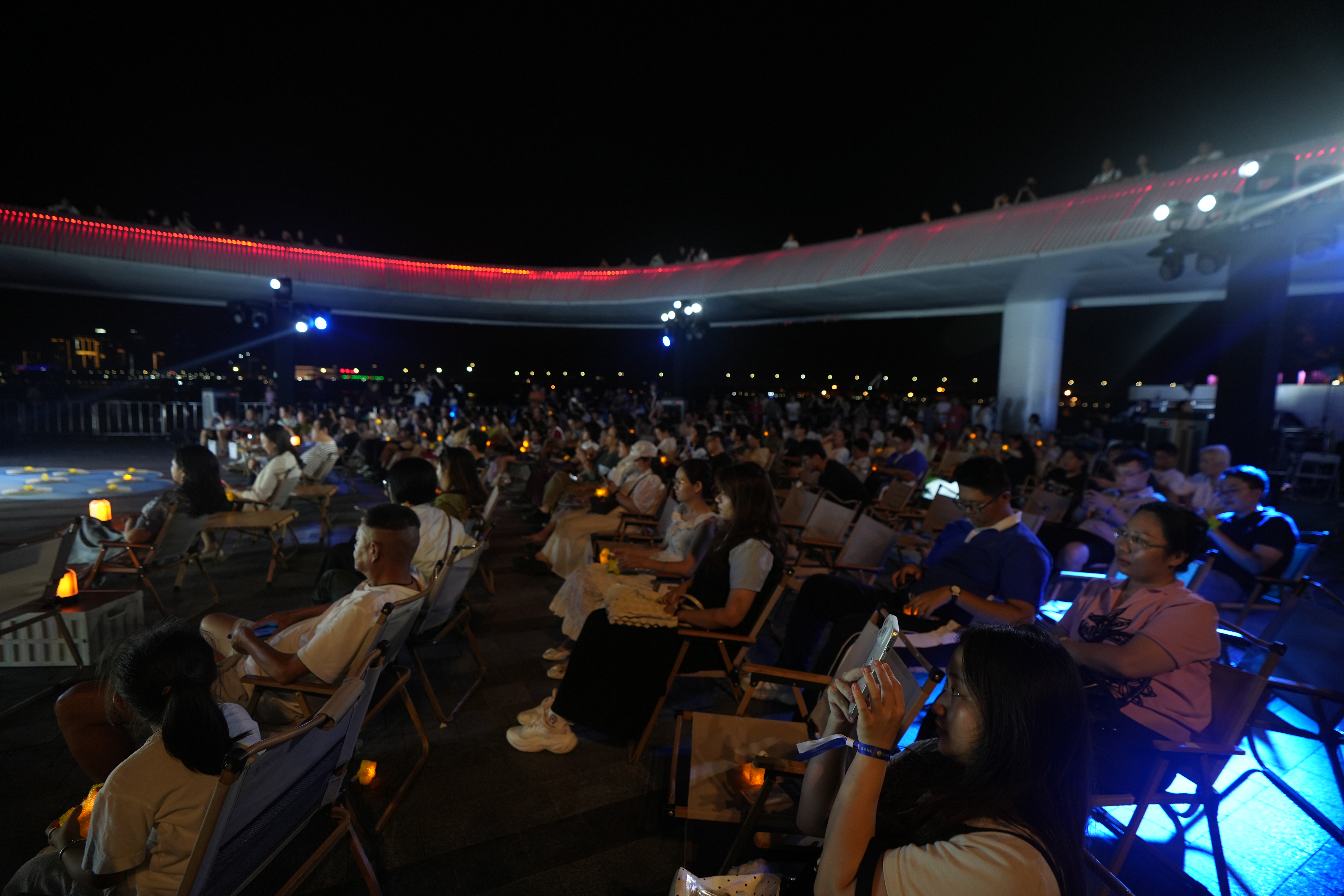 9月30日晚,“潮音海上来·滨海观月”沉浸式音乐会在欢乐港湾飞虹广场温情上演,以此开启国庆+中秋双节序章。音乐会以“海洋”为灵感,围绕“自然”主题展开,在国庆中秋假期前夕,于城市高楼与开阔海景的交界处,以自然为笔、音乐为墨,渲染出一片治愈色调,为忙碌的都市人打造了一处可听、可感、可沉浸的“心灵避风港”。