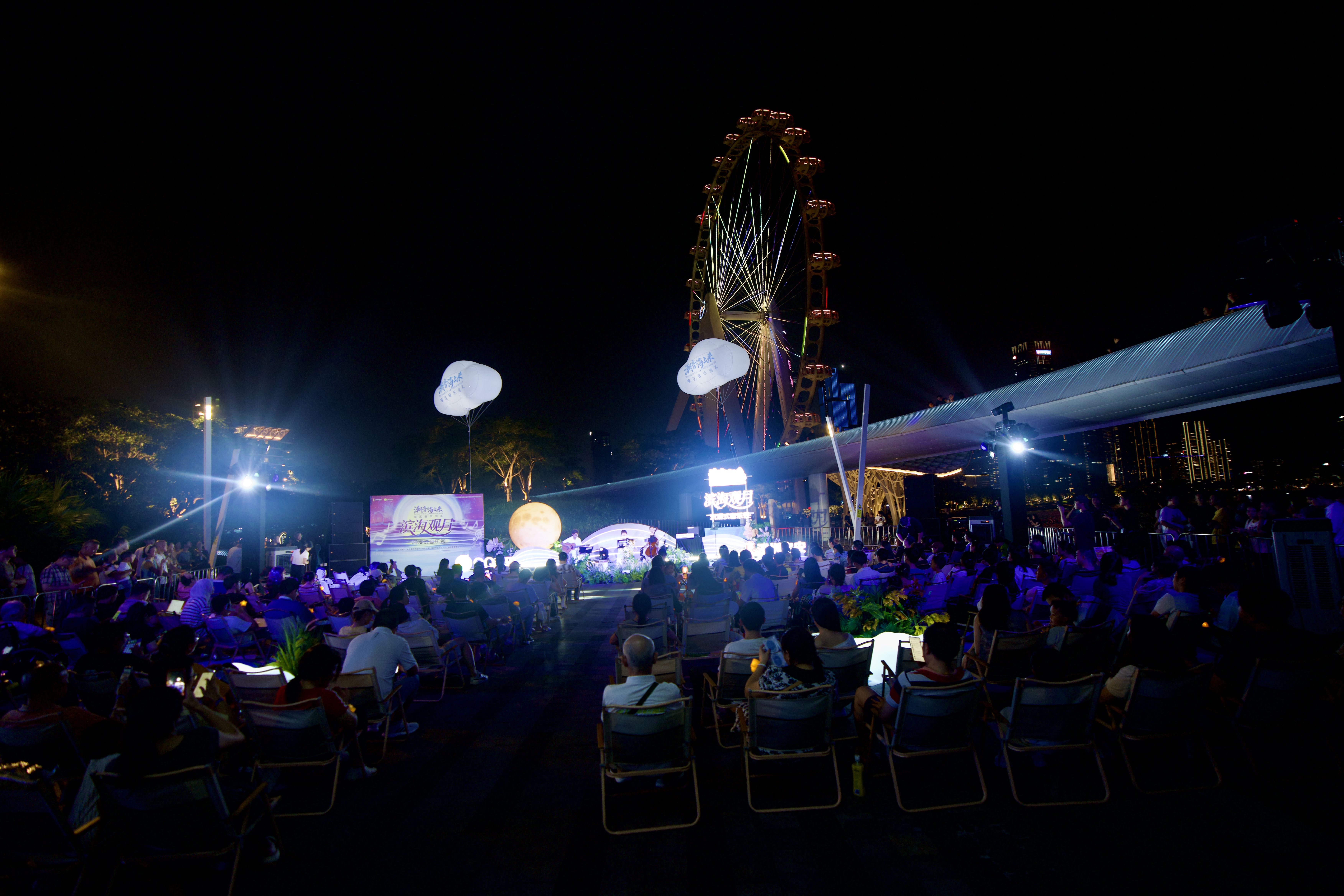舞台后方,欢乐港湾标志性的摩天轮闪烁着温暖灯光,宛若一轮明月升空,与现场设置的发光月球装置相映成趣,构成“双月同天”的浪漫景致。众多市民携家人朋友前来,在音乐与海风中提前感受国庆与中秋的节日温馨氛围。