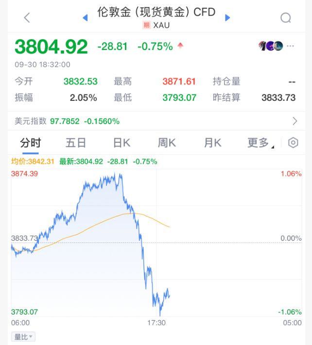 9月30日A股收盘之后,现货黄金价格大幅跳水,早盘受美国政府停摆担忧推动,一度大涨超1%,创下3871美元/盎司的新高。截至19时,黄金价格跌约0.8%,回落至每盎司约3800美元。