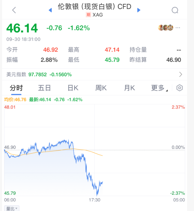 现货白银的价格也同步下跌。