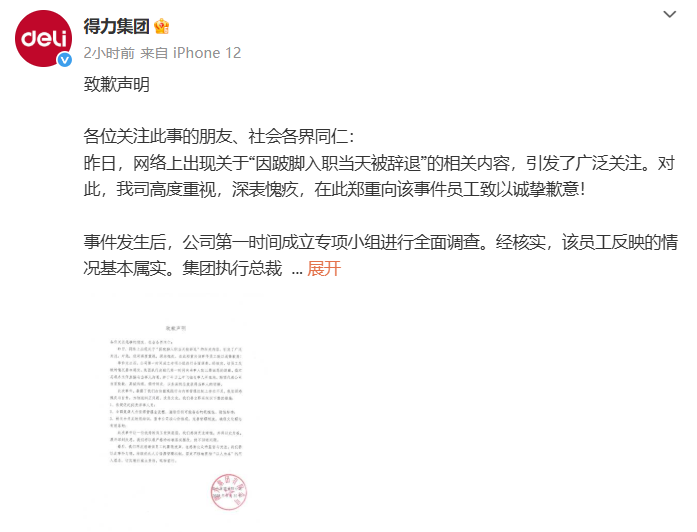 得力就“员工因跛脚入职当天被辞退”致歉:依规依纪问责涉事人员