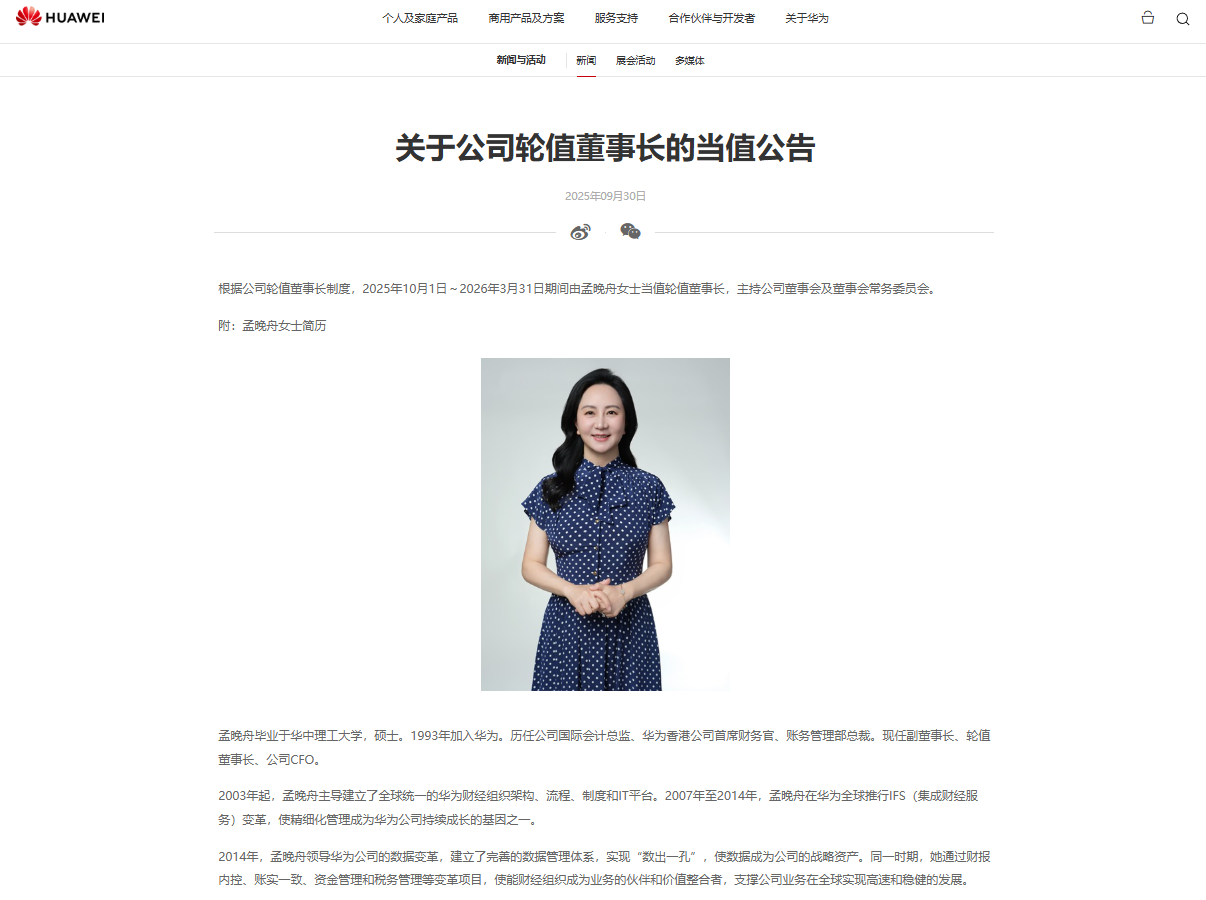 9月30日,华为官网显示,根据公司轮值董事长制度,2025年10月1日~2026年3月31日期间由孟晚舟女士当值轮值董事长,主持公司董事会及董事会常务委员会。👉新闻详情