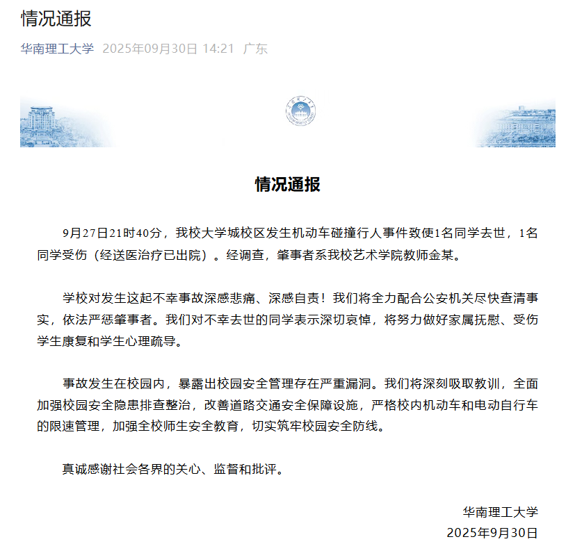 华南理工大学通报“校内发生车祸致1死1伤”:肇事者系学校教师,将全力配合查清事实